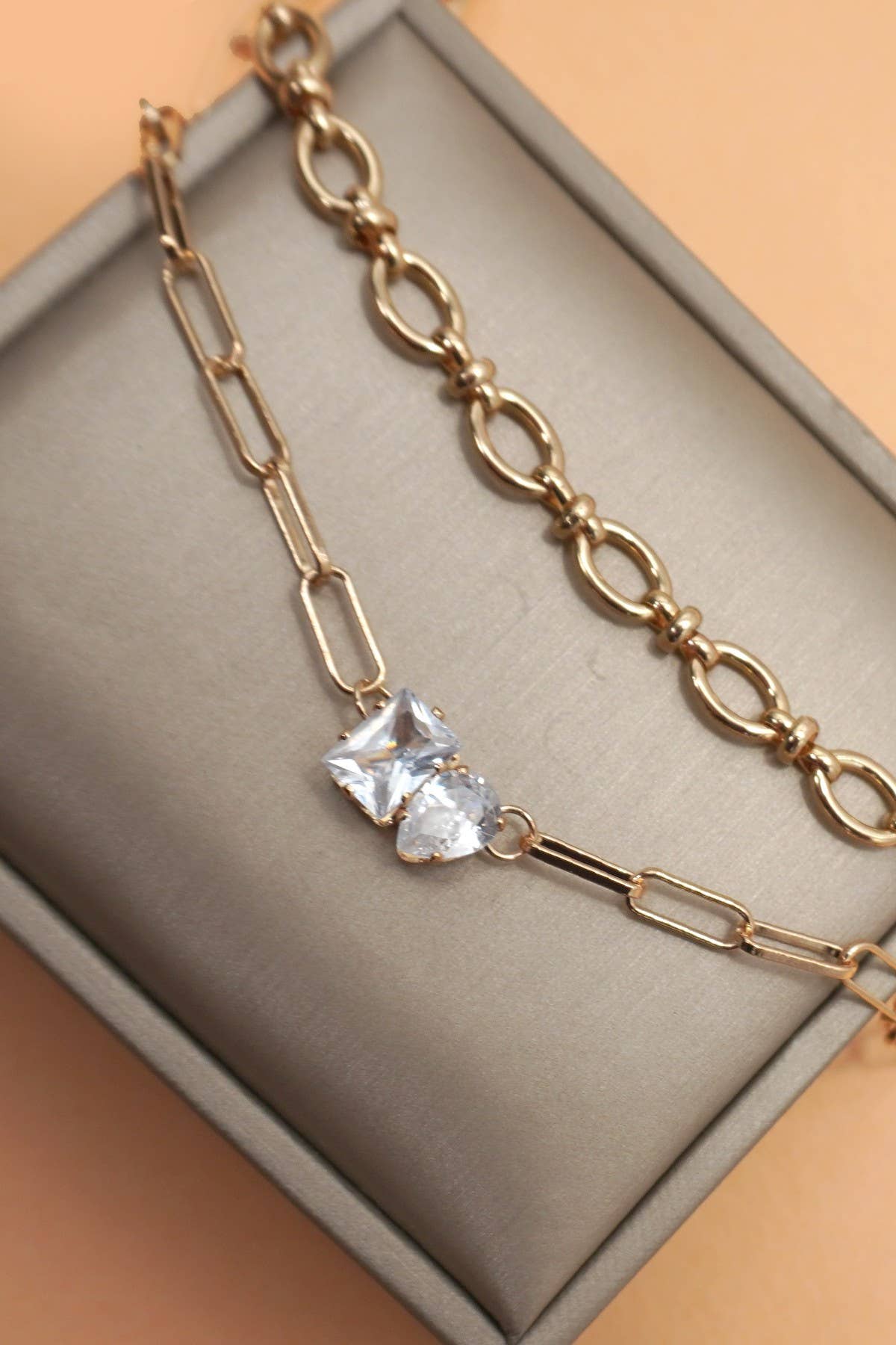 This Elegant Duo Crystal Necklace pairs a classic rounded link chain with a modern paperclip-style chain, anchored by two shimmering clear crystals. The contrasting crystal shapes—one emerald-cut and one heart-shaped—sit side by side for a striking, contemporary look.