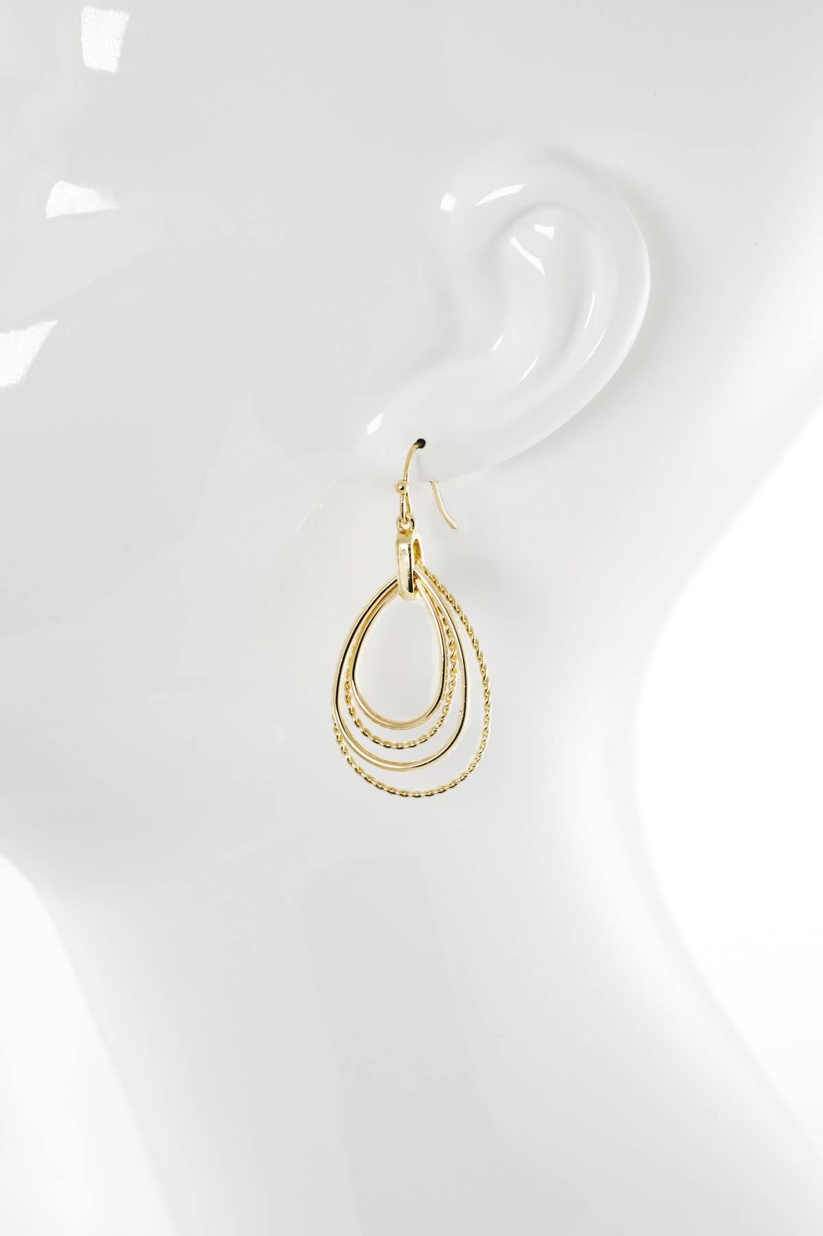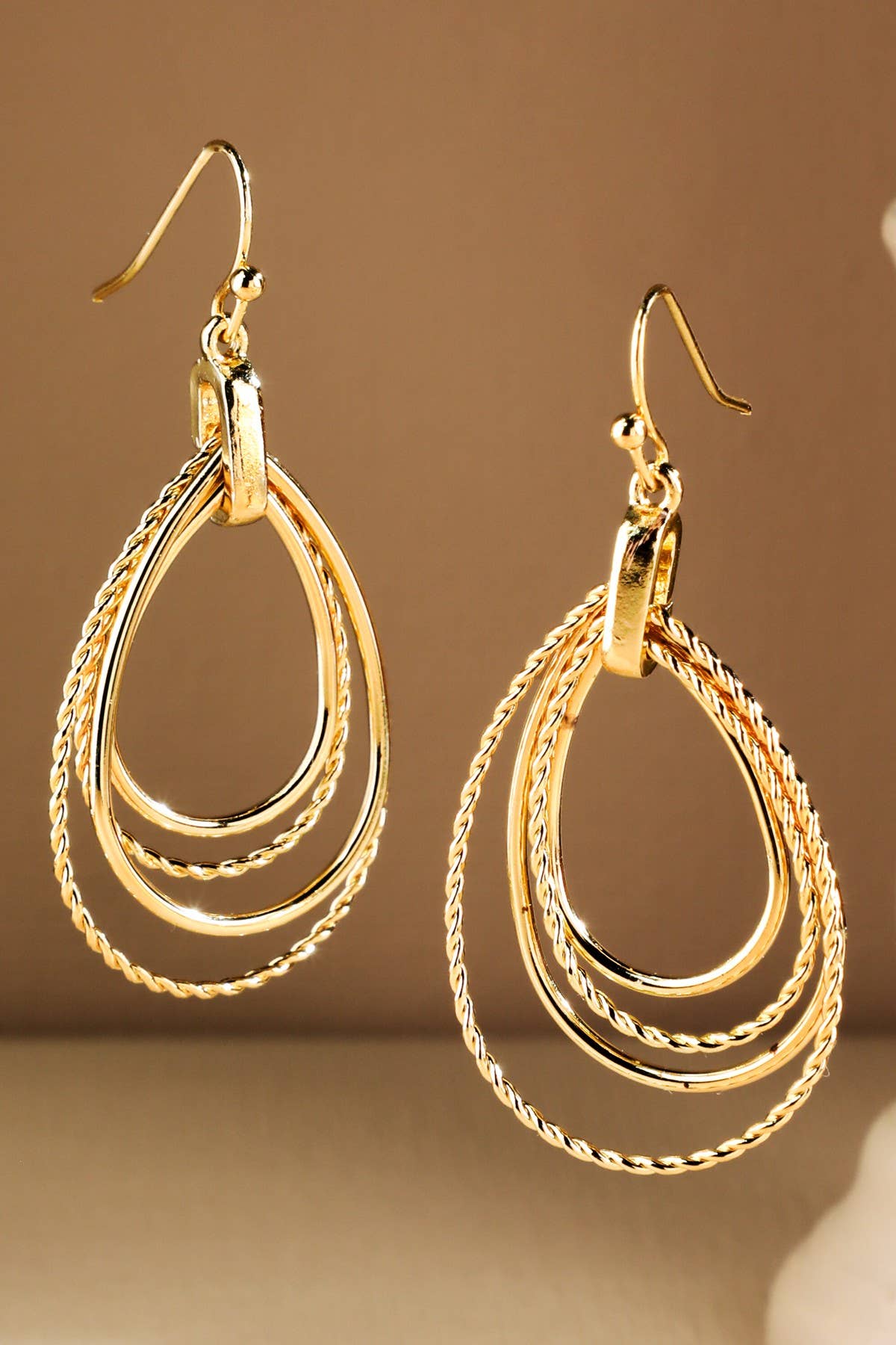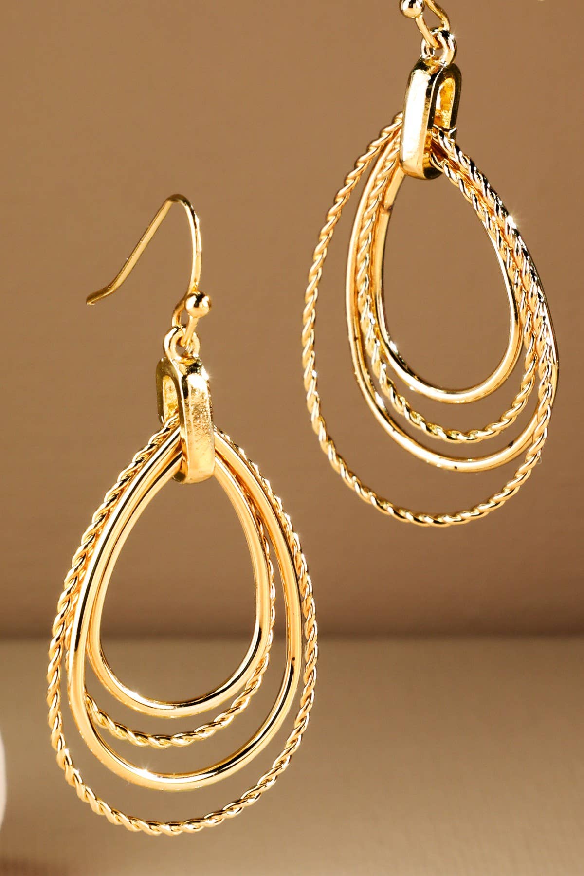 Layered Teardrop Earrings are a striking mix of smooth and twisted teardrop frames, artfully nested and linked from a slim fishhook. Designed to catch the light with a gentle swing, these earrings feature a polished, worn-gold finish for understated elegance. Lightweight and effortlessly chic, they are perfect for both everyday wear and special occasions.