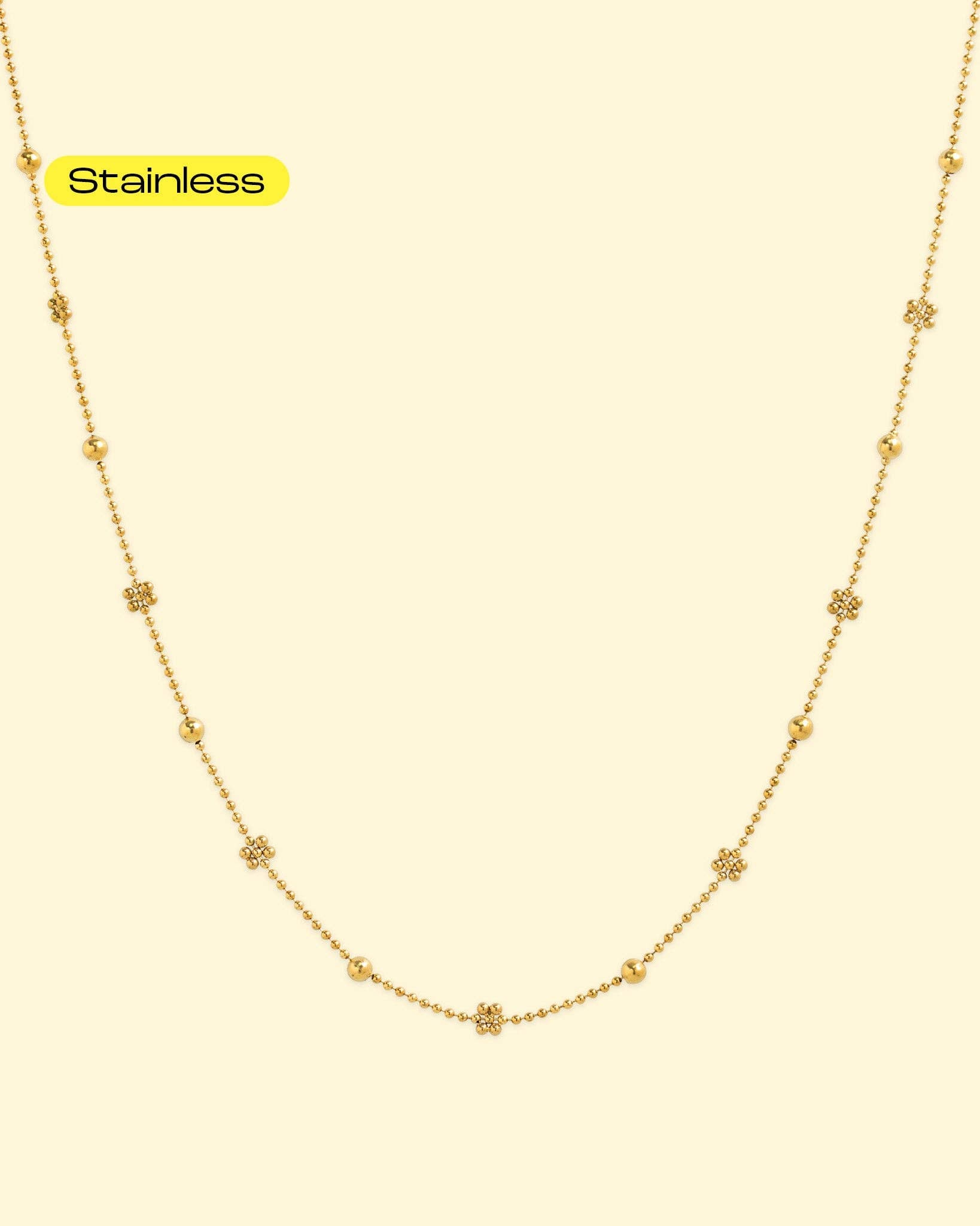 Elevate your everyday look with the Clover Charm Dainty Necklace. Featuring a sleek chain accented with evenly spaced polished gold beads, this necklace offers a clean, minimalist silhouette that’s perfect for layering or wearing solo. Crafted from durable stainless steel, it is waterproof, tarnish-resistant, and designed for long-lasting shine. It provides the perfect fit for any neckline, making it a versatile and timeless addition to your jewelry collection.