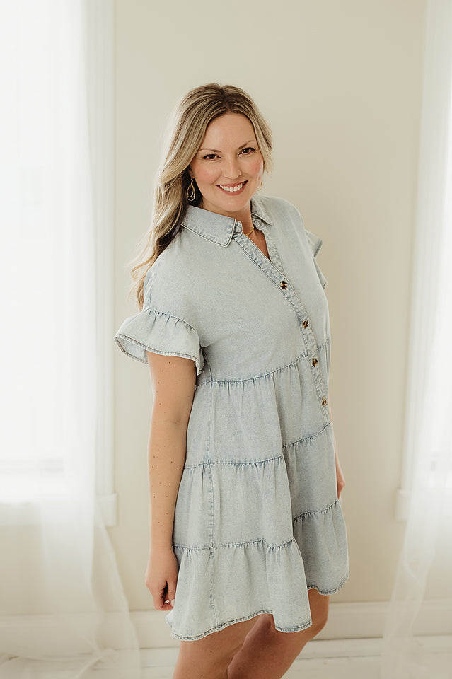 The Chambray Ruffle Shirt Dress combines effortless style with playful detailing. Crafted from soft, mineral-washed chambray, this dress features a half button-down front, short ruffle sleeves, and tiered layers for a flirty, feminine silhouette. Its relaxed fit and lightweight fabric make it perfect for casual outings, weekend adventures, or easy layering, offering a laid-back yet stylish look for any occasion.