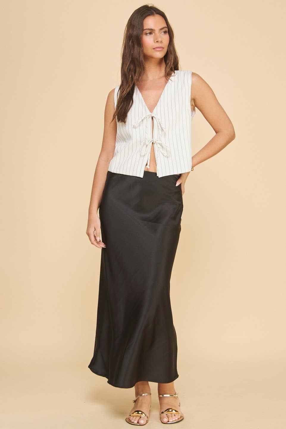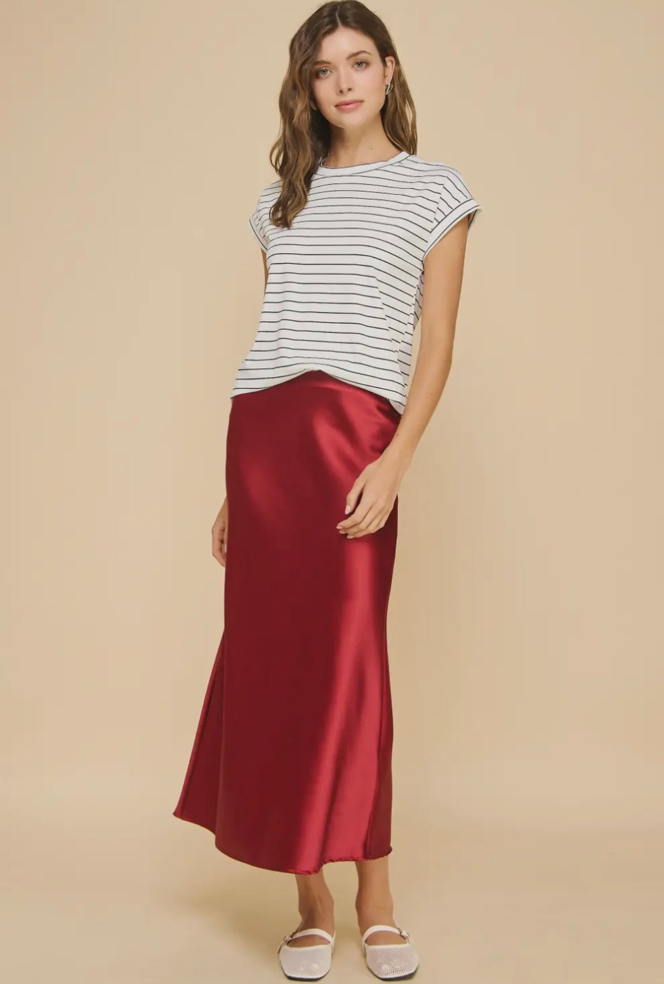 Step into understated luxury with the Aniston Satin Skirt. Crafted in the USA, this silky midi features a timeless slip design and a soft, stretch waistband that moves with you. Dress it up or down—its polished versatility makes it perfect for every moment.