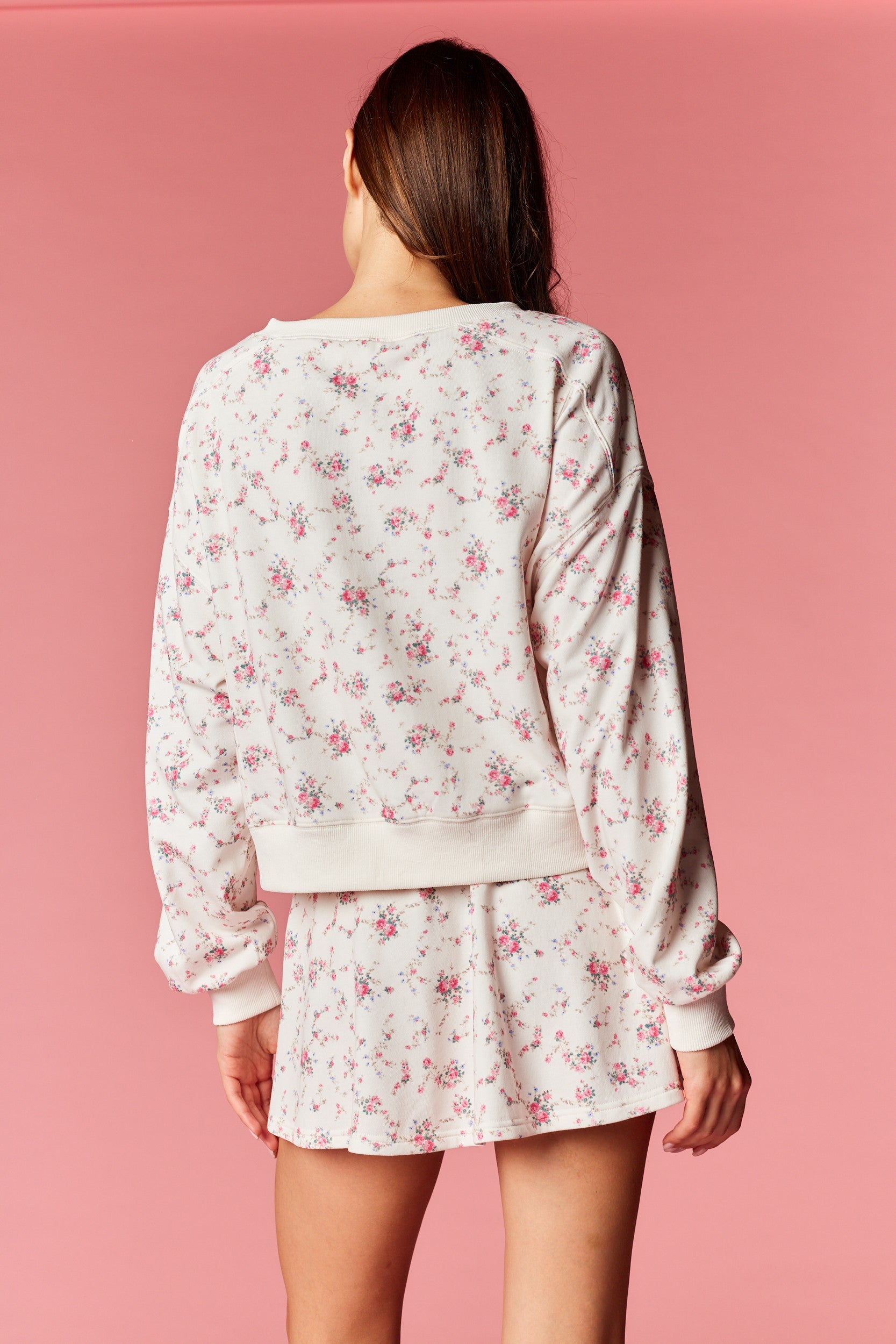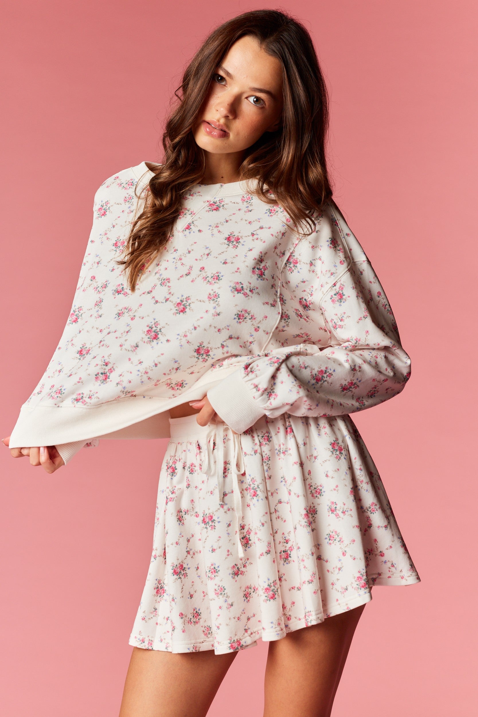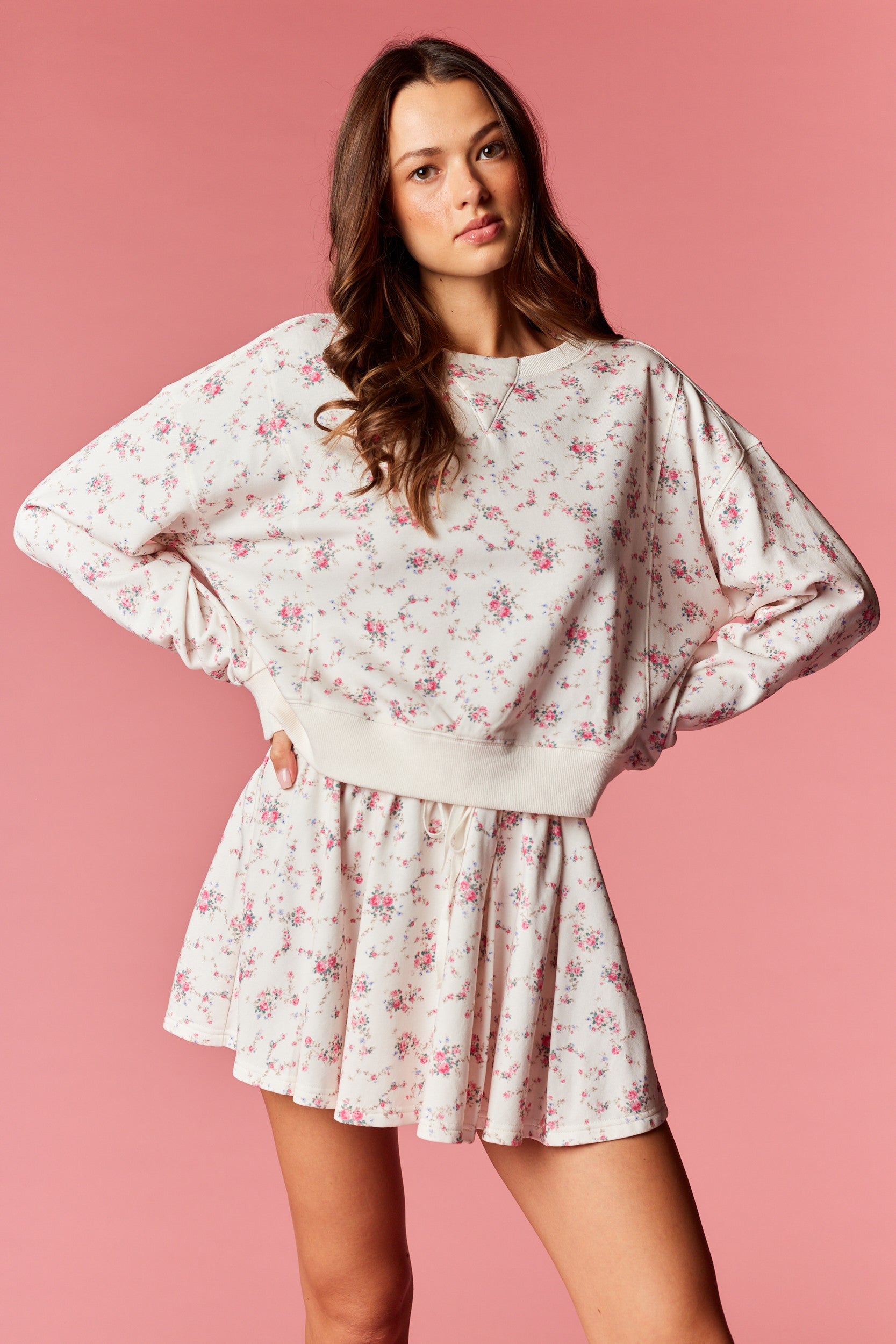 This two-piece Mini Floral Lounge Set pairs cozy comfort with romantic, vintage-inspired charm, featuring a soft ivory base with a delicate pink ditsy floral print. Designed in a lightweight, breathable brushed knit, it includes a relaxed-fit crewneck top with dropped shoulders and ribbed cuffs, along with a flowy mini skirt (skort) finished with an elastic drawstring waistband for adjustable comfort. Feminine yet laid-back, the gentle fabric and effortless silhouette make it perfect for lounging, relaxed weekends, or casual outings where comfort and sweetness go hand in hand.
