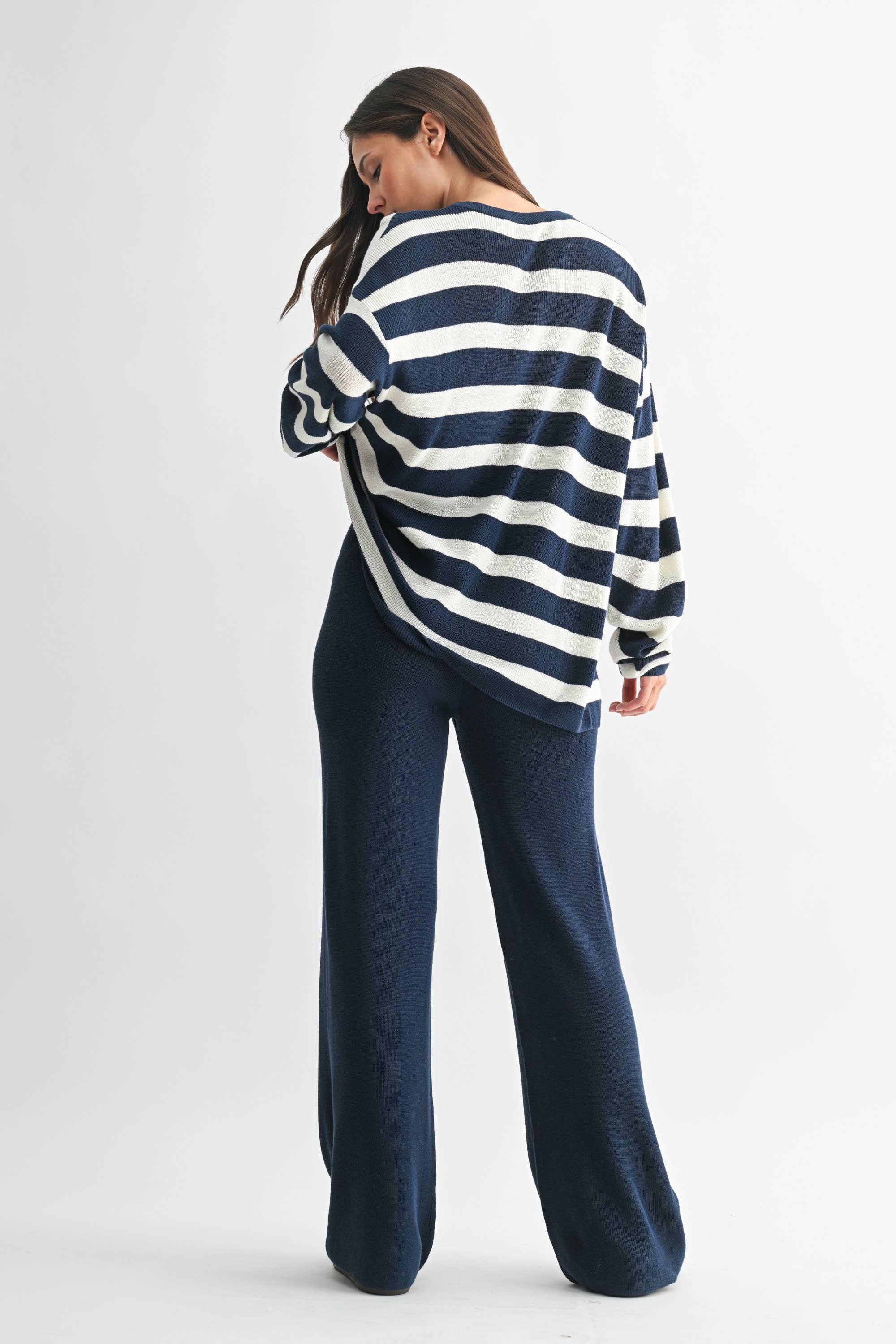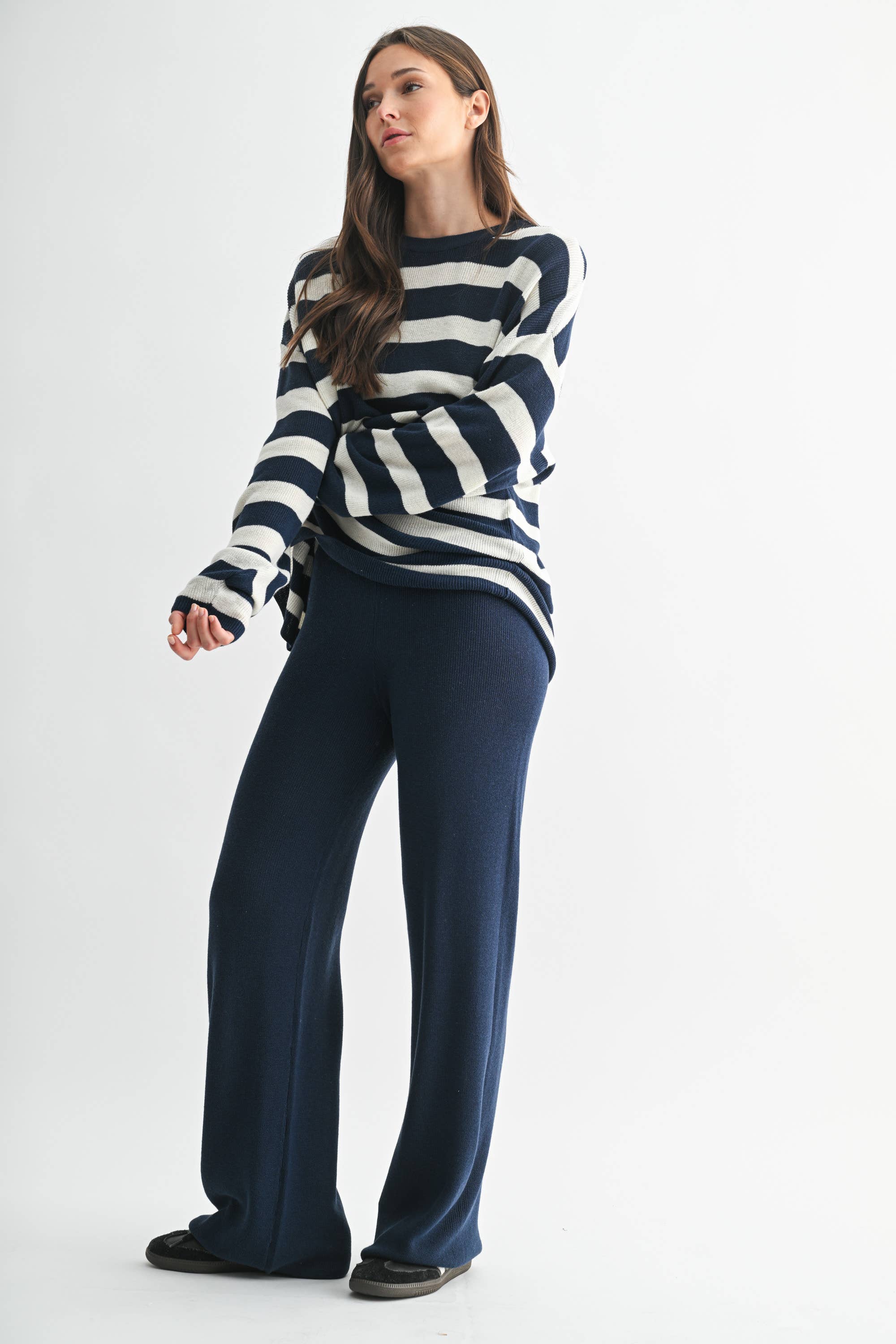 Laid-back, oversized, and undeniably chic. The Soft Wave Stripe Set features a longline, wide-stripe sweater knit from a soft cotton blend for that breathable, cozy feel. Designed with extra-long drop shoulder sleeves and a slouchy fit, it brings effortless ease to your everyday look. The matching solid wide-leg pants have a smooth elastic waistband and a draped silhouette that flows with you—perfect for lounging or stepping out in elevated comfort.