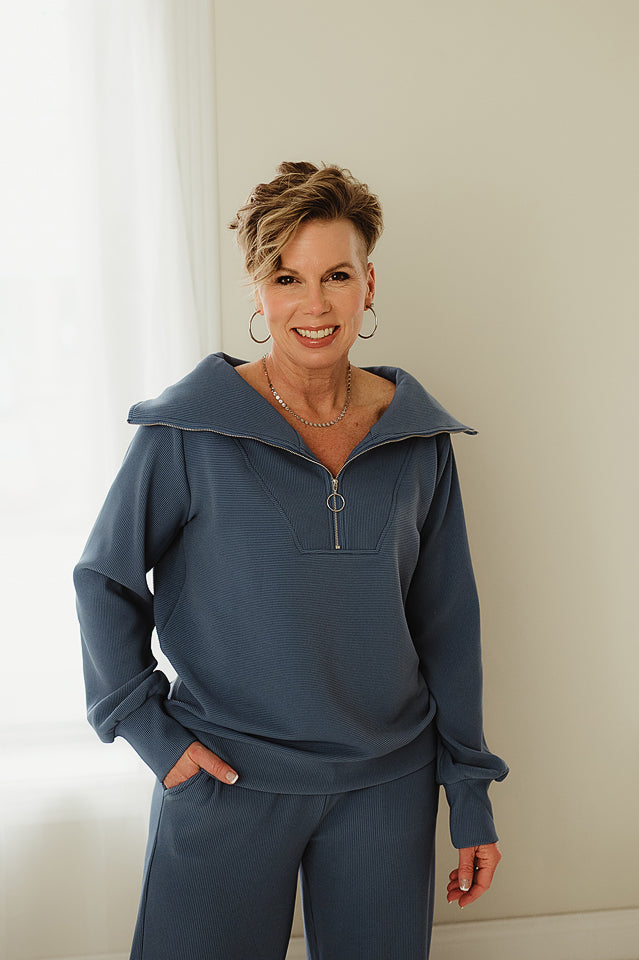 Cozy up in style with this adorable, ribbed set that's basically a hug you can wear! The high neck half zip pullover pairs perfectly with matching pants, giving you that effortlessly put-together vibe without trying too hard. The ribbed texture adds visual interest while keeping things soft and comfortable—ideal for lounging, running errands, or pretending you have your life together. Mix, match, or wear as a set; either way, you'll feel like the most comfortable version of yourself.