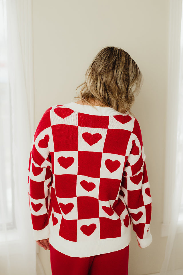Make a bold statement this season with this playful Checkerboard Heart Sweater. Designed in an oversized relaxed fit, it features an all-over heart pattern set against a classic check background for a sweet yet modern look. Soft knit construction ensures cozy comfort, while the drop-shoulder silhouette adds a laid-back, casual vibe. Perfect for layering over jeans or leggings, this piece effortlessly blends cute and contemporary style—ideal for Valentine's season or everyday wear with a touch of charm.
