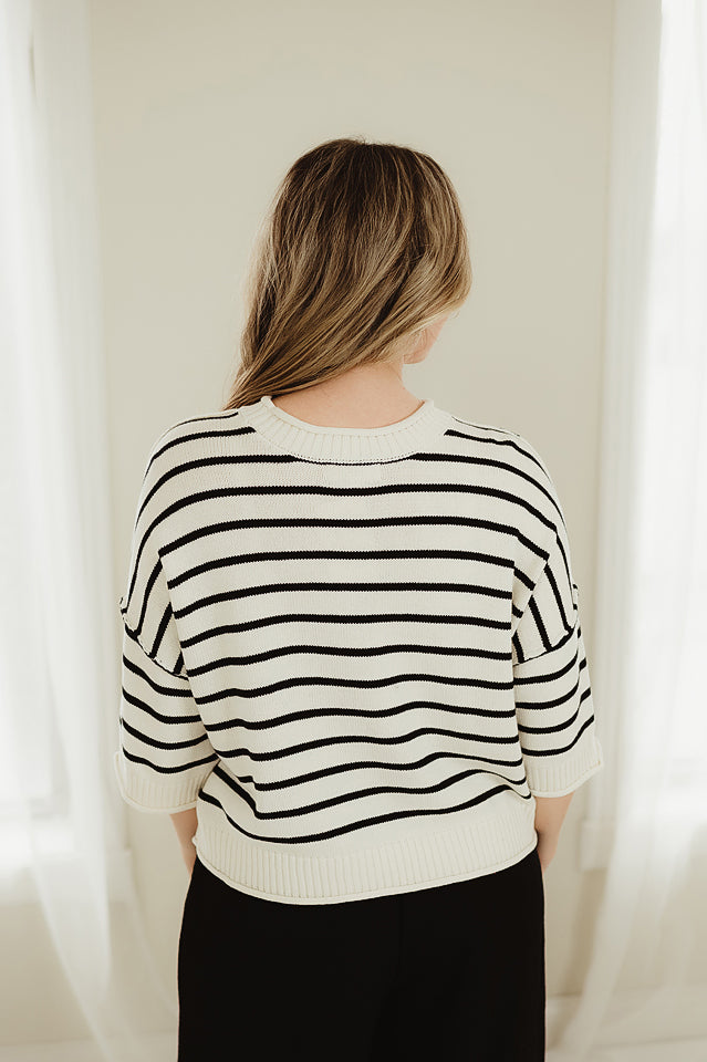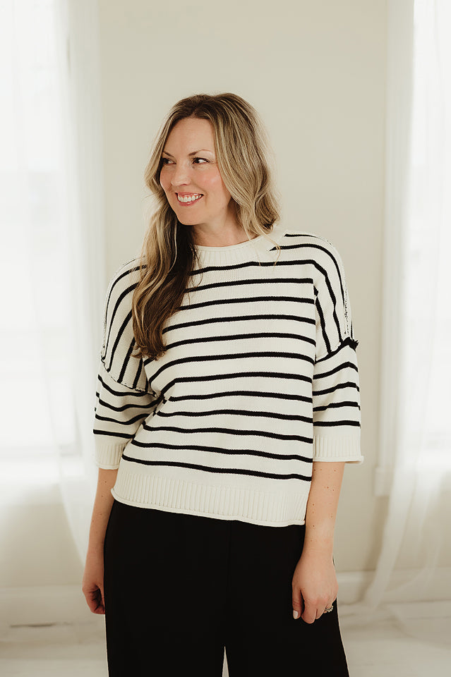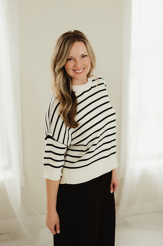 The Boardwalk Pullover striped knit top features a classic round neckline and relaxed drop shoulders for an effortlessly casual feel. Designed with a slightly loose fit, it offers comfortable, easy movement while maintaining a flattering silhouette. The rolling edge hem adds a subtle, lived-in detail that enhances its laid-back charm, making it a versatile staple perfect for everyday styling.