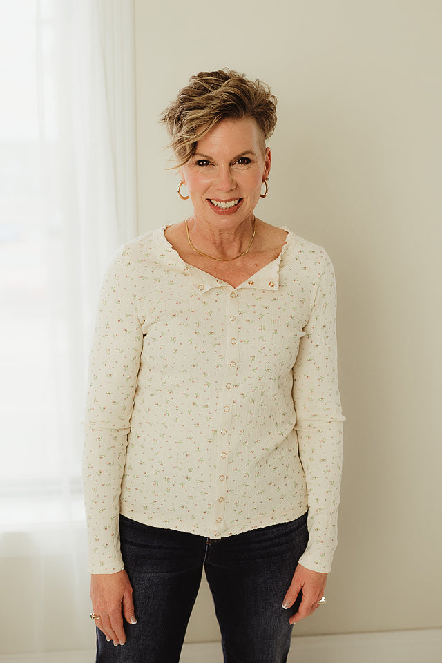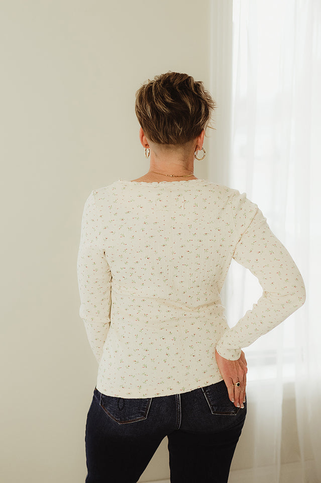Introducing the Sweet Bloom Ribbed Top—your new go-to for effortless style! This charming floral piece features a delicate pointelle ribbed knit that's both breathable and flattering. Snap buttons make getting dressed a breeze, while the double raw edge hem adds an edgy, modern touch. Garment-washed for that coveted vintage lived-in vibe, it's perfect for layering or wearing solo. Cozy, cute, and ready for anything.