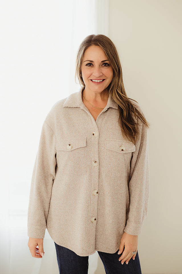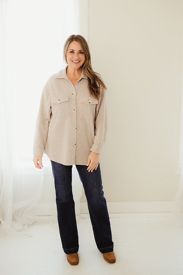 Our Brushed Waffle Shacket is the perfect blend of cozy comfort and effortless style, crafted from soft brushed thermal fabric with a relaxed oversized silhouette and subtle drop shoulders that make it ideal for layering in cooler weather; designed with classic chest flap pockets and double front pockets for both function and structure, this long-sleeved button-down piece exudes warmth and sophistication while keeping your look laid-back and versatile—pair it with jeans and ankle boots for a trendy outfit that transitions seamlessly from casual outings to stylish evenings.