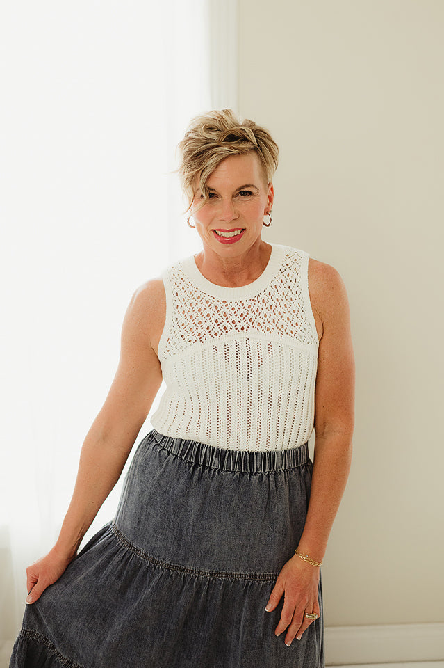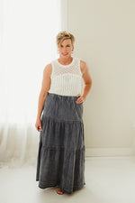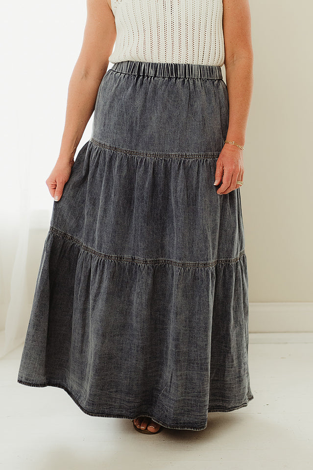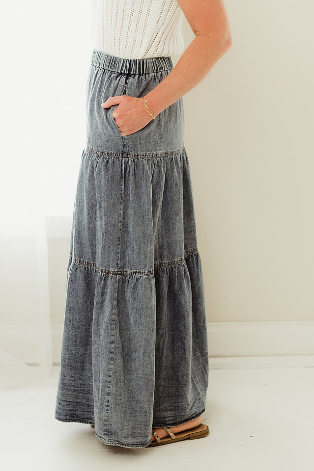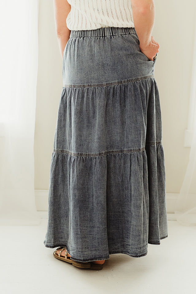 Swish and twirl in our Chateau Chambray Skirt! This playful tiered denim delight features a comfy elastic waistband that hugs in all the right places. With handy pockets for your treasures and a flowy silhouette that dances with every step, this washed denim beauty is ready for adventures from farmers markets to sunset strolls. Your new go-to for effortless style!