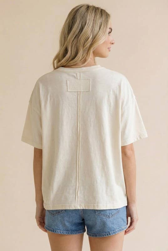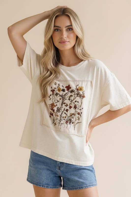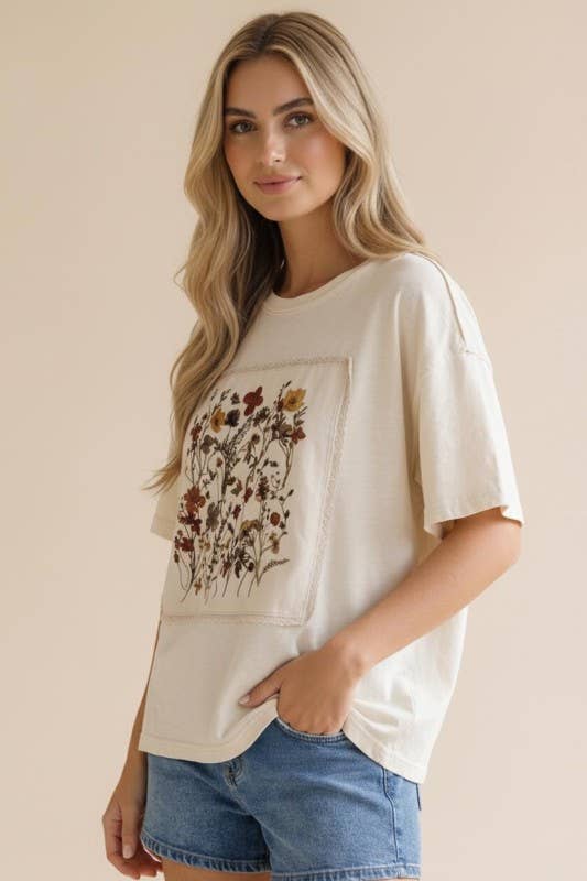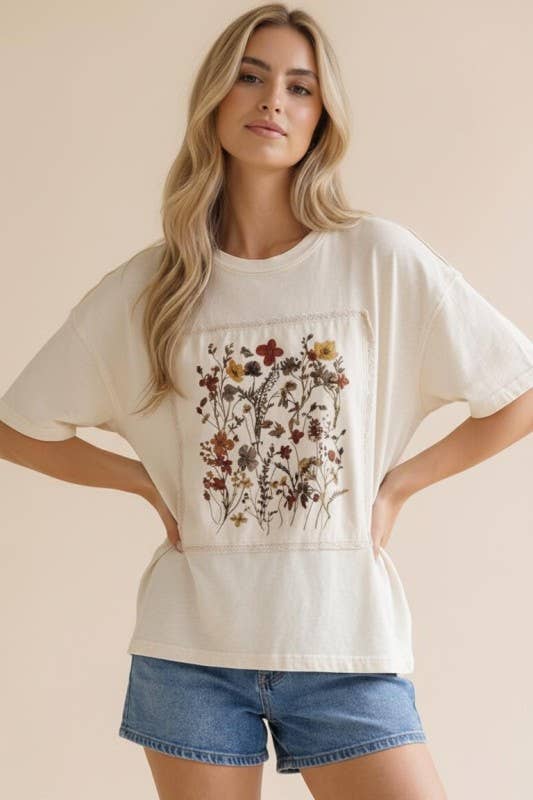 This effortlessly stylish Cottage Bloom Top blends comfort with a touch of vintage charm, featuring a classic round neckline, relaxed drop shoulders, and short sleeves for an easygoing silhouette. The oversized, loose fit drapes beautifully, creating a laid-back yet flattering look. A vintage-inspired floral screen print adds a soft, nostalgic feel, while crochet edge accents and patchwork details bring subtle texture and artisanal character. Perfect for casual days, it pairs effortlessly with denim or shorts for a relaxed, standout style.