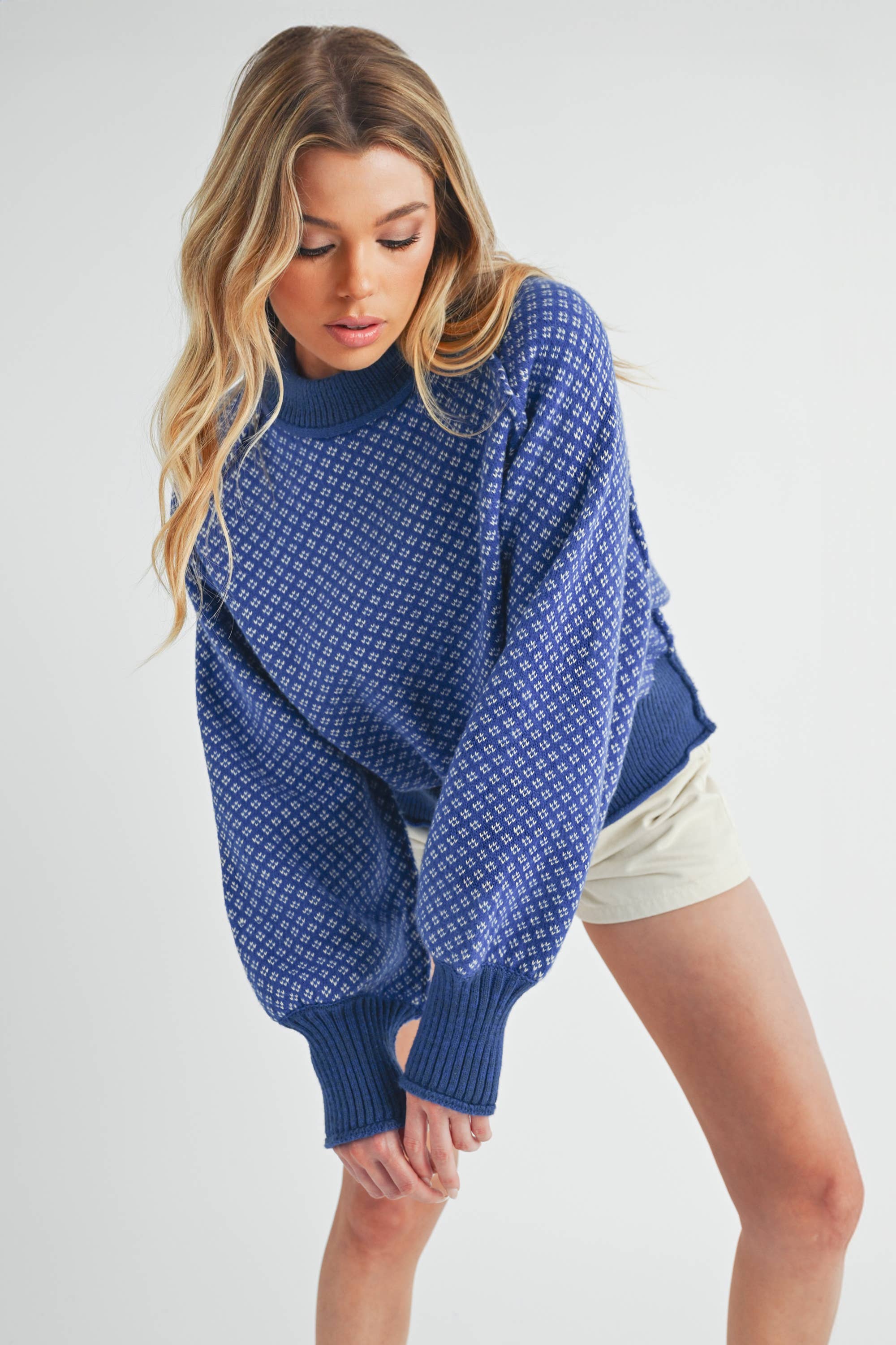 This soft pullover Warm Whisper Pullover sweater, crafted from a knit fabric, features an oversized fit with a chunky ribbed neckline and raglan sleeves. Its slouchy, oversized design includes ribbed trim, a chunky mock neckline, slouchy raglan sleeves with exaggerated cuffs, and a banded bottom hem. Elevate your knitwear collection with this versatile pullover, perfect for layering up or down.