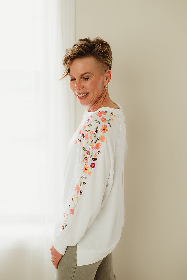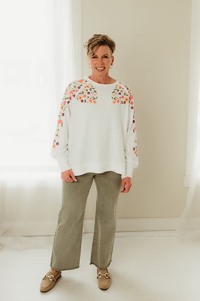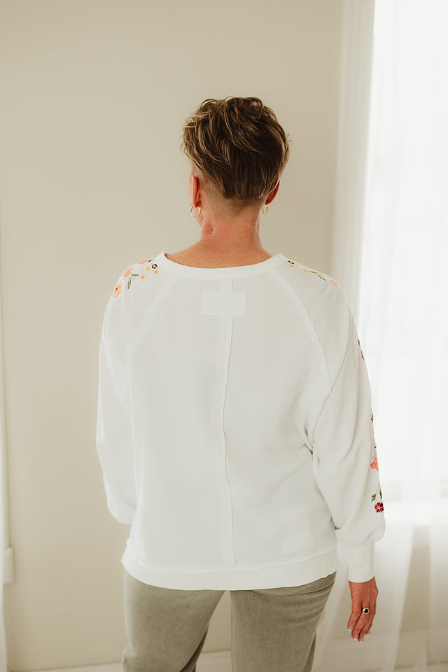 Get cozy in our Stitched Elegance Pullover! Made with soft French terry fabric, this pullover features colorful floral embroidery and ribbed banding. Raw edge detailing adds a touch of uniqueness, while garment washing gives it a vintage feel. Perfect for a fun and stylish look!