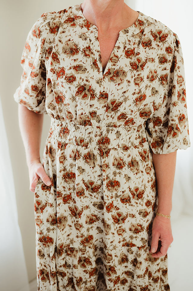 Step out in style with the Harvest Stroll Dress, featuring playful 3/4 sleeves and a flattering midi length. This printed dress adds a fun pop of color to your wardrobe while cozy pockets keep your essentials close. Perfect for sunny days and breezy evenings, it blends comfort and charm for effortless everyday wear.