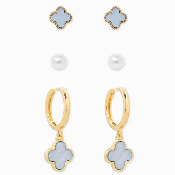 Trio Pearl Clover Set - the clovers in these earring sets are all made with the elegant mother of pearl clovers, both the stud and the drop hoop earrings. Add a classic pearl stud for a stunningly classic earring set of three.