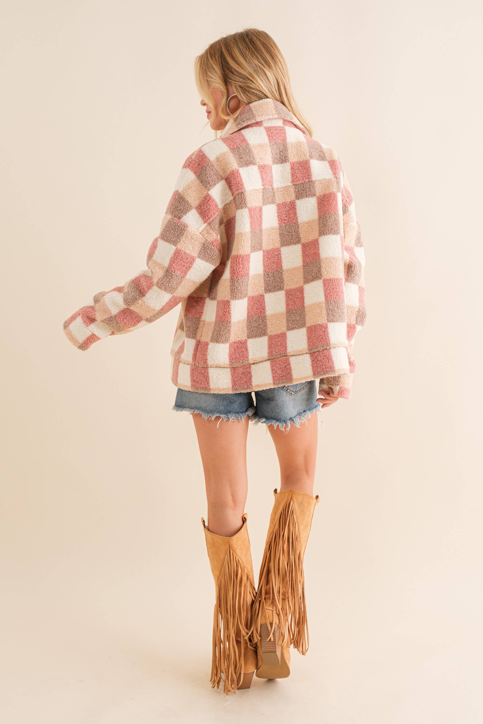 The Checkered Teddy Jacket delivers cozy texture with standout style. Designed with an oversized, relaxed fit, this button-up layer features a soft teddy fabric, classic checkered pattern, and a functional chest pocket for added charm. Perfect for cool-weather layering, it’s an easy throw-on piece that brings warmth, comfort, and effortless style to any casual look.