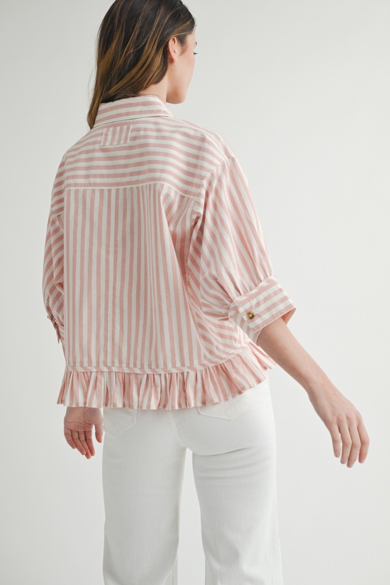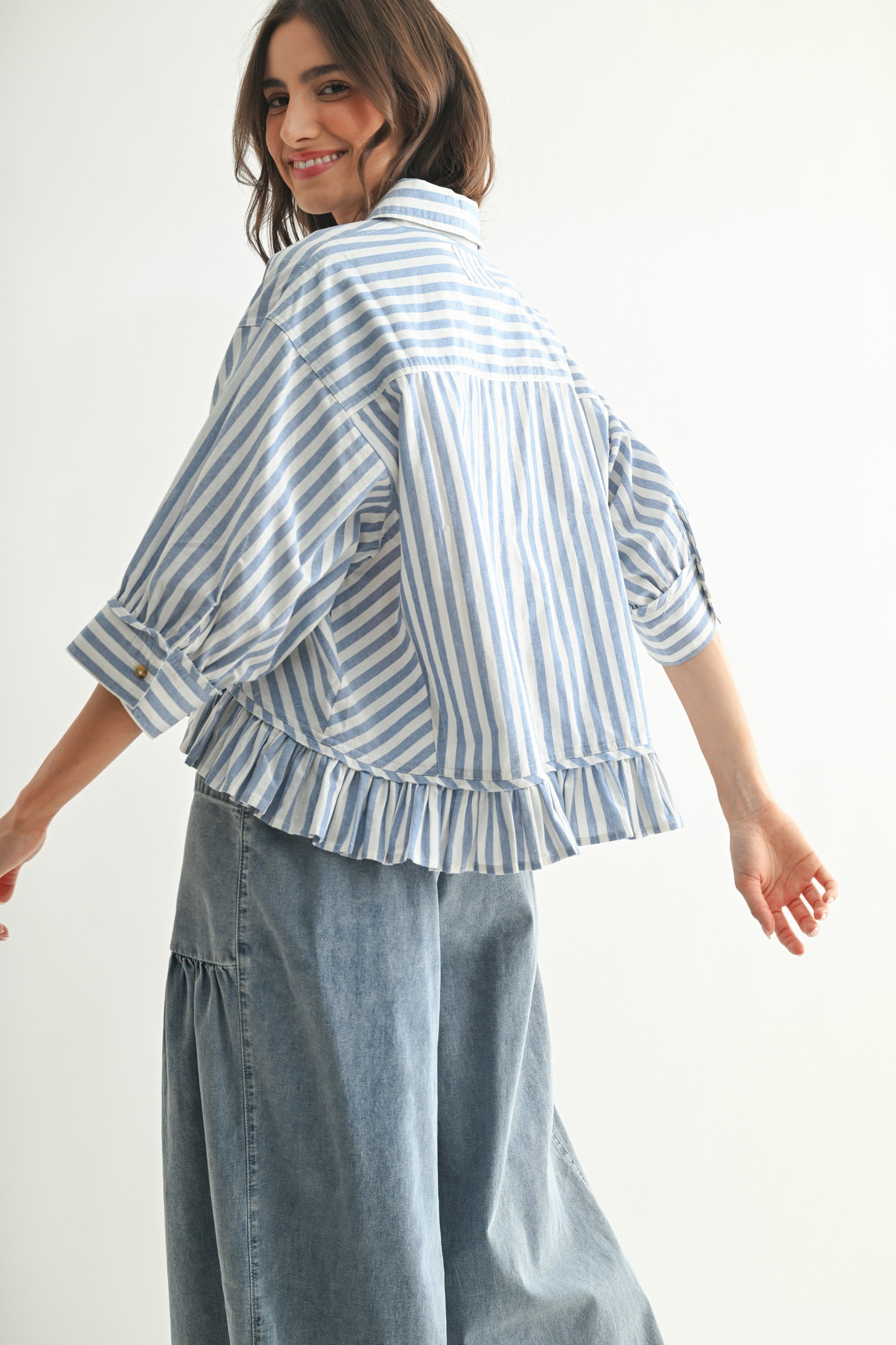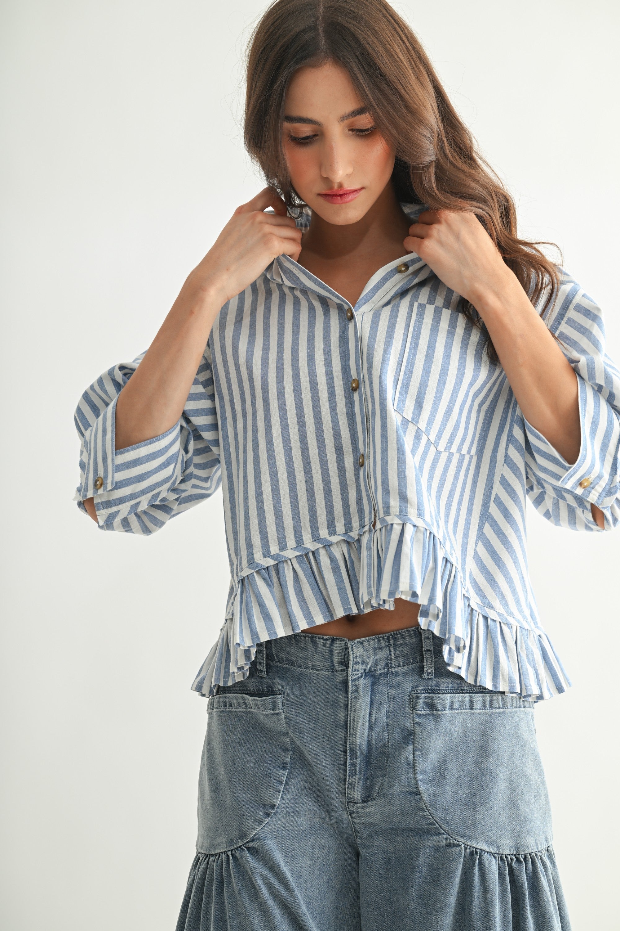Step into effortless elegance with our Elise Striped Ruffle Blouse, where timeless sophistication meets modern style. Designed to transition seamlessly from day to night, this versatile blouse keeps you impeccably dressed for any occasion. Classic, delicate stripes lend a refined charm, while the ruffled hem adds a soft, feminine touch that flatters your silhouette and elevates your look with subtle movement and grace.