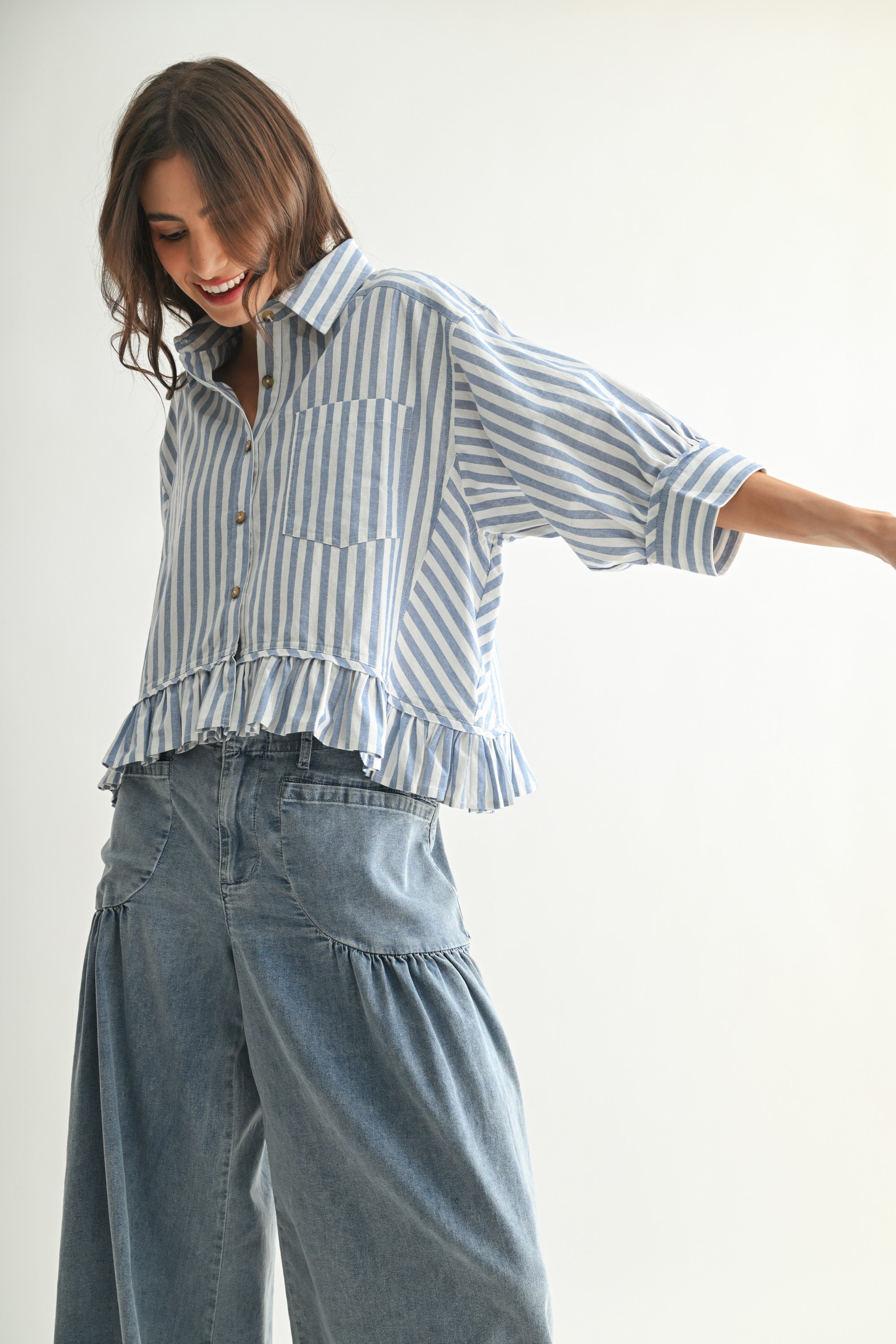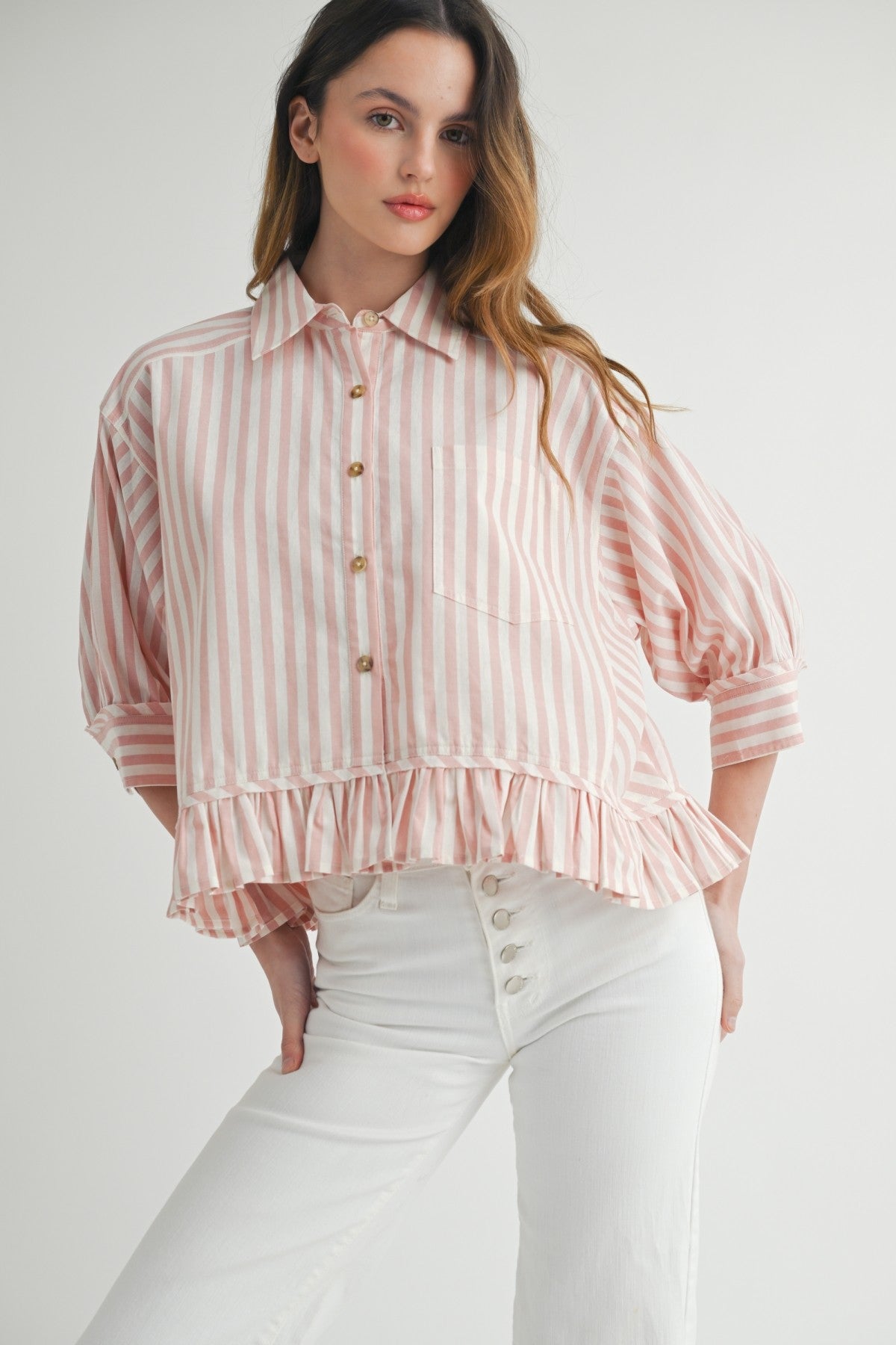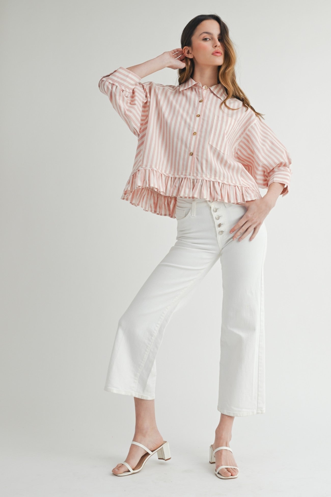 Step into effortless elegance with our Elise Striped Ruffle Blouse, where timeless sophistication meets modern style. Designed to transition seamlessly from day to night, this versatile blouse keeps you impeccably dressed for any occasion. Classic, delicate stripes lend a refined charm, while the ruffled hem adds a soft, feminine touch that flatters your silhouette and elevates your look with subtle movement and grace.