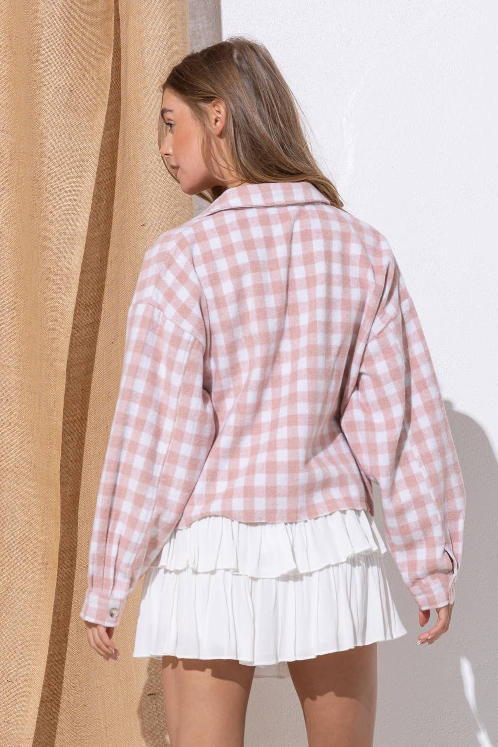 The Gingham Crop Jacket blends classic charm with cozy comfort. Featuring a soft brushed finish, cropped silhouette, and functional front pocket details, this versatile layer is perfect for transitional styling. The timeless gingham pattern adds a playful yet polished touch, making it easy to throw on over tees, knits, or dresses for an effortlessly chic look.