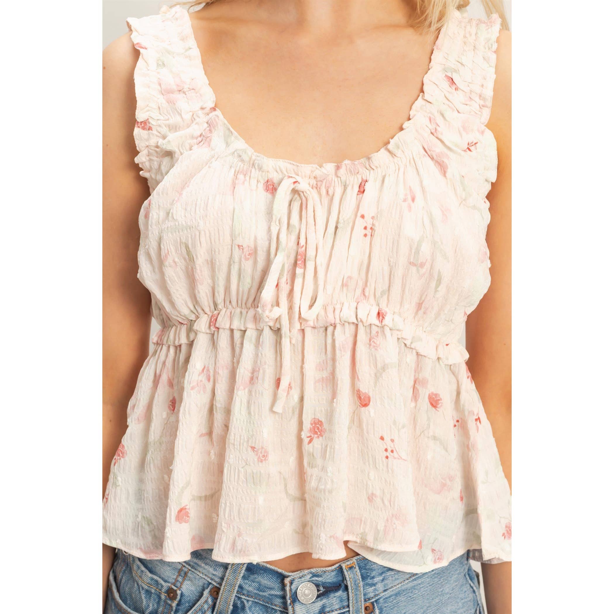 This Garden Ruffled Tank features a ruched neckline with adjustable ties and a flattering peplum silhouette. Crafted from textured dotted Swiss fabric, it offers a light, airy feel. The sleeveless cut and ruffled straps add a playful touch, making it perfect to pair with denim shorts and sandals for an easy, breezy summer look.