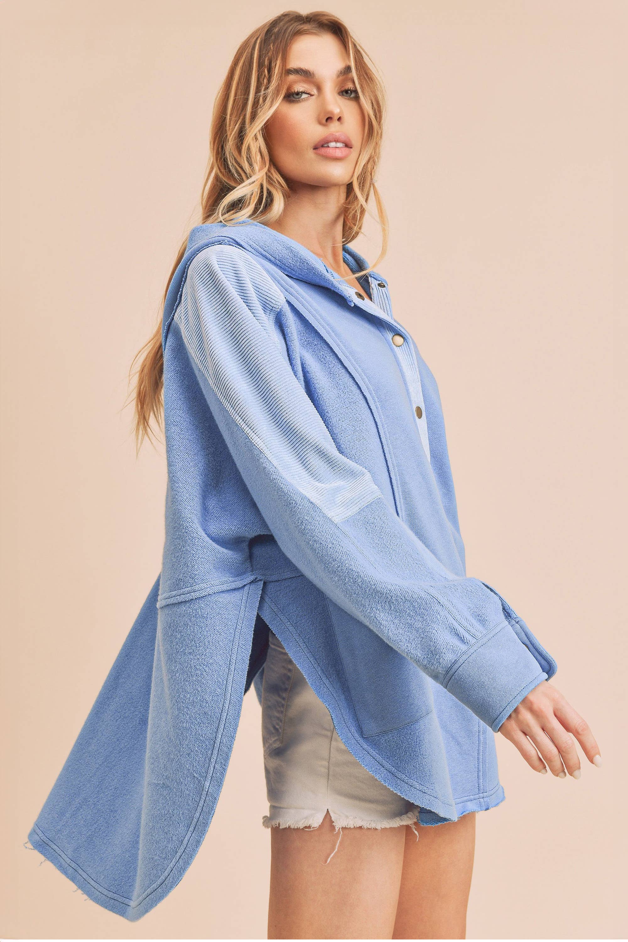 Our favorite mixed-media Solid Dove Pullover features an oversized henley silhouette accented with contrasting corduroy panels and raw seam details throughout for an effortlessly lived-in look. Cozy yet elevated, this standout piece is perfect for layering up or down—whether paired with denim for casual days or styled over leggings for laid-back comfort.