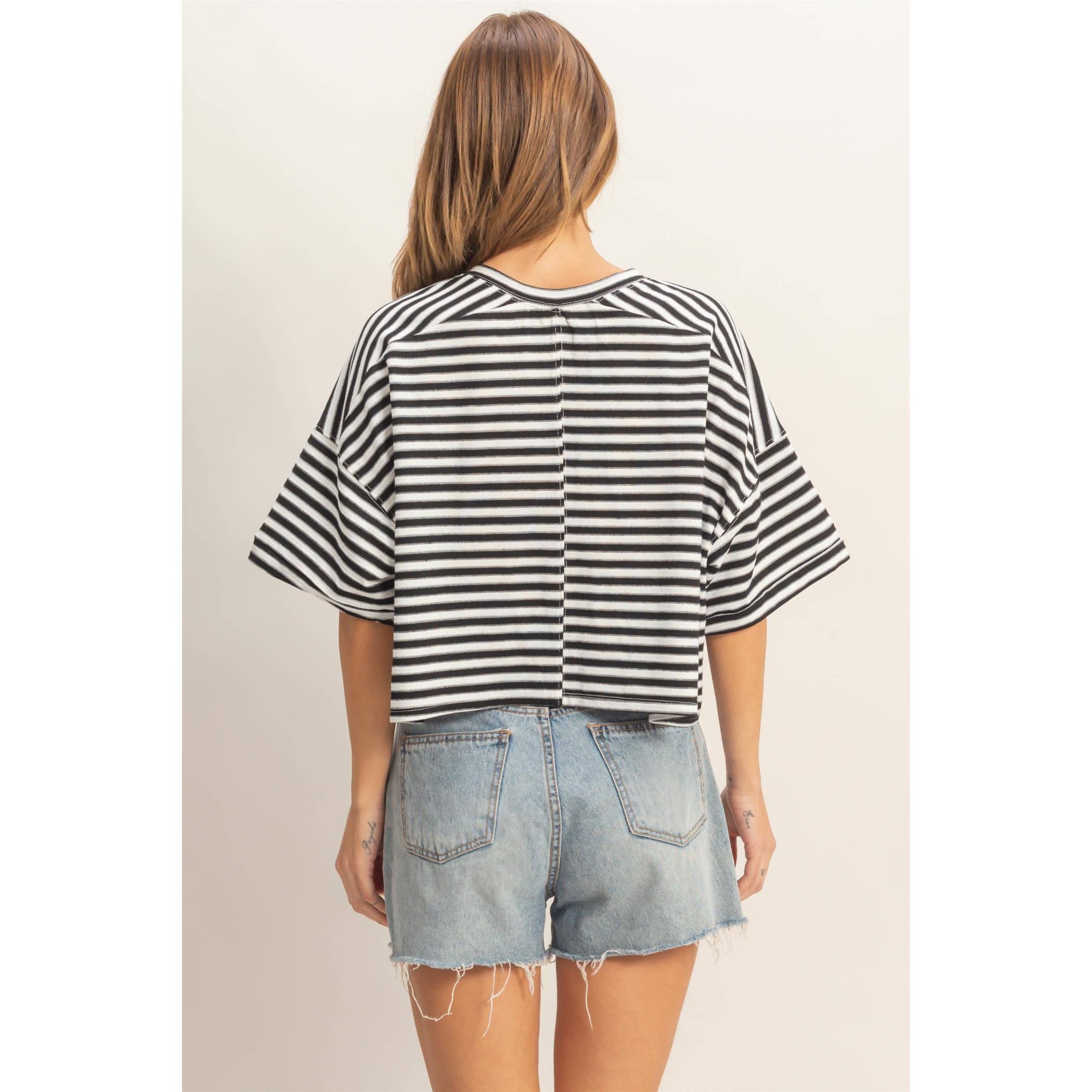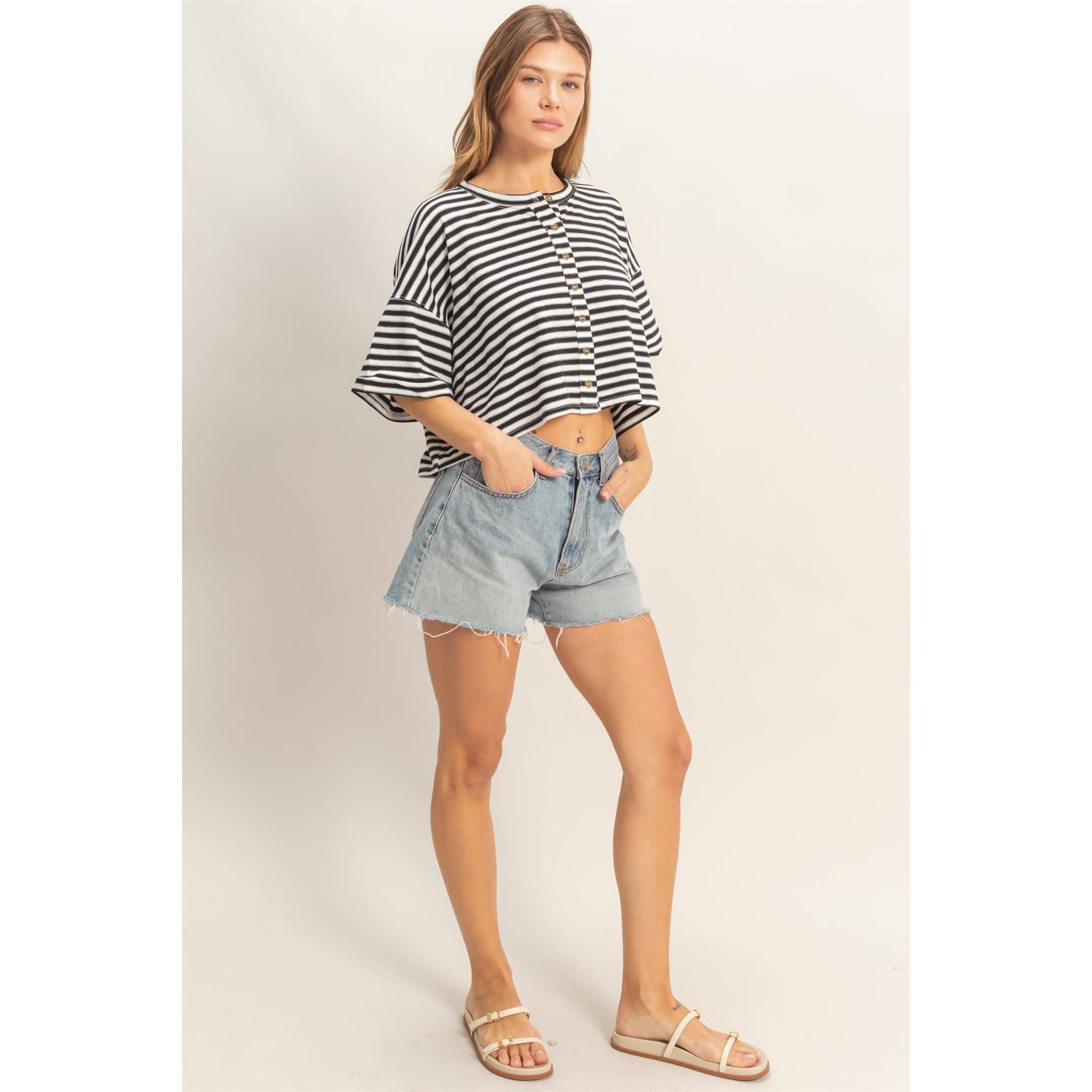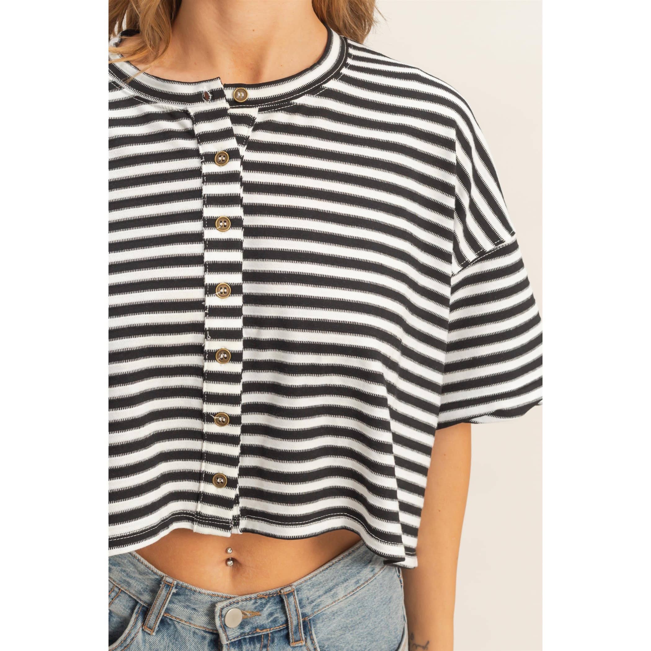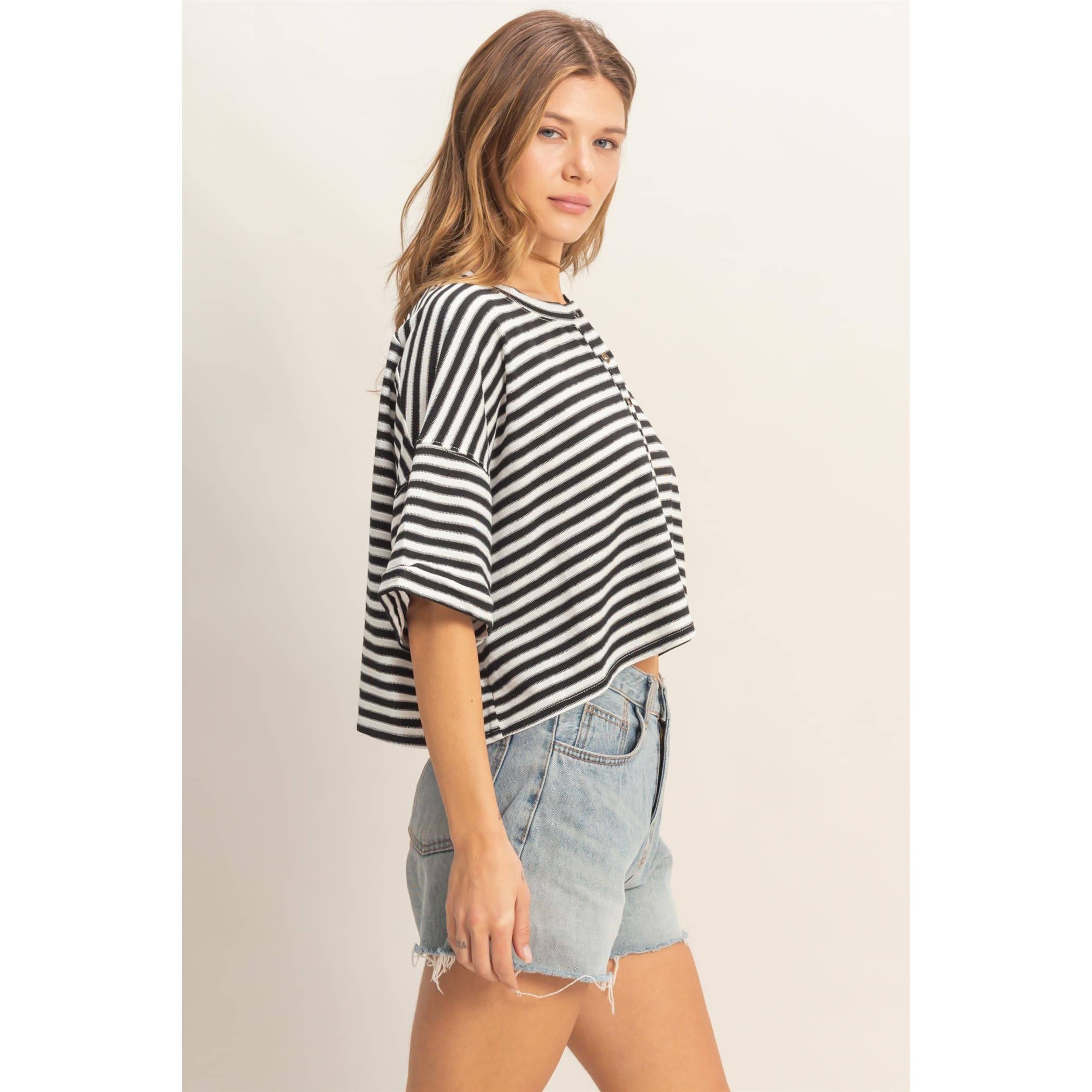 Shoreline Cropped Henley is a relaxed striped tee designed with an easy crew neckline and a casual button‑up front. The loose fit gives it that effortless, laid‑back vibe, making it perfect for everyday wear. Style it with high‑waisted jeans and sneakers for a clean, comfortable look that feels naturally put‑together.