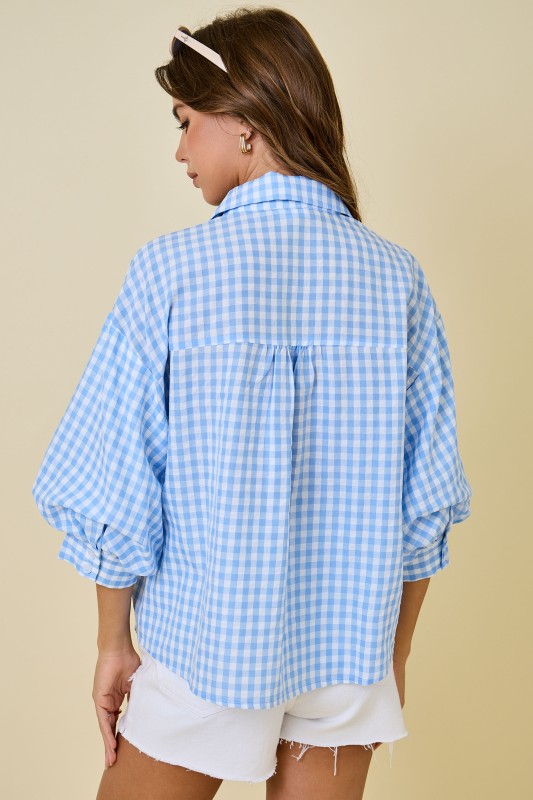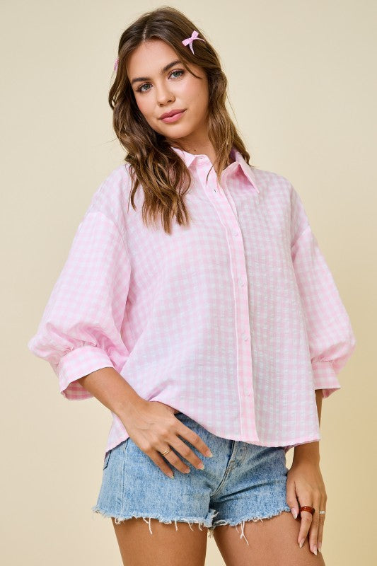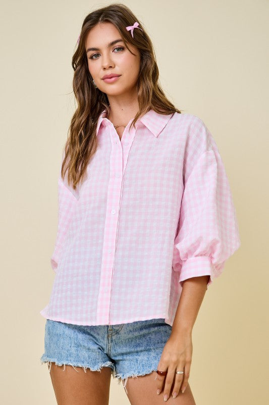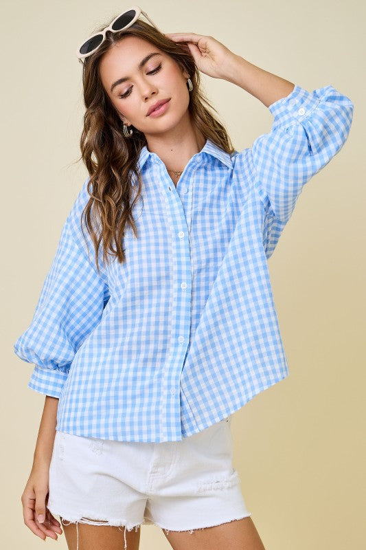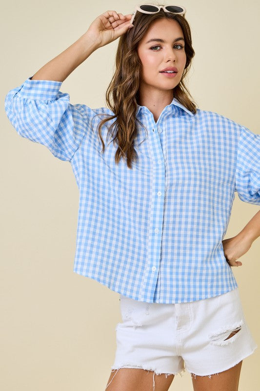 Bring effortless charm to your wardrobe with this delightful Sweet Gingham Charm button-down featuring playful 3/4 bubble sleeves. The classic gingham pattern adds a touch of vintage-inspired sweetness, while the voluminous sleeves create a fun, feminine silhouette that's perfect for casual outings or dressed-up occasions. Easy to style and endlessly versatile, this shirt pairs beautifully with jeans, skirts, or trousers for a look that's always on-trend.