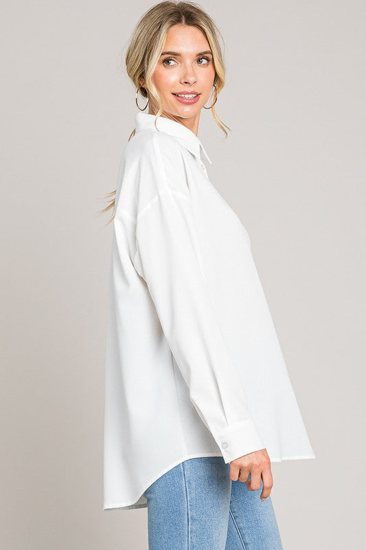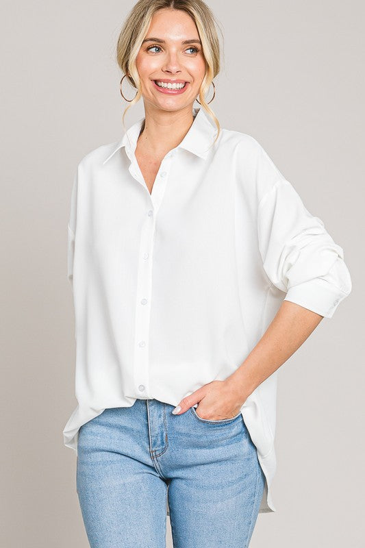 Effortlessly chic and ready for anything, The Luxe Layer Blouse is your new wardrobe MVP. Crafted from slightly stretchy crepe, this oversized shirt features a relaxed drop shoulder silhouette with a flattering back yoke that moves with you. Buttoned cuffs and an oversized sleeve design create that coveted laid-back elegance, while the flat button placket keeps things streamlined. It's the perfect piece to layer, tie up, or wear solo. Versatile, comfortable, and undeniably cool.