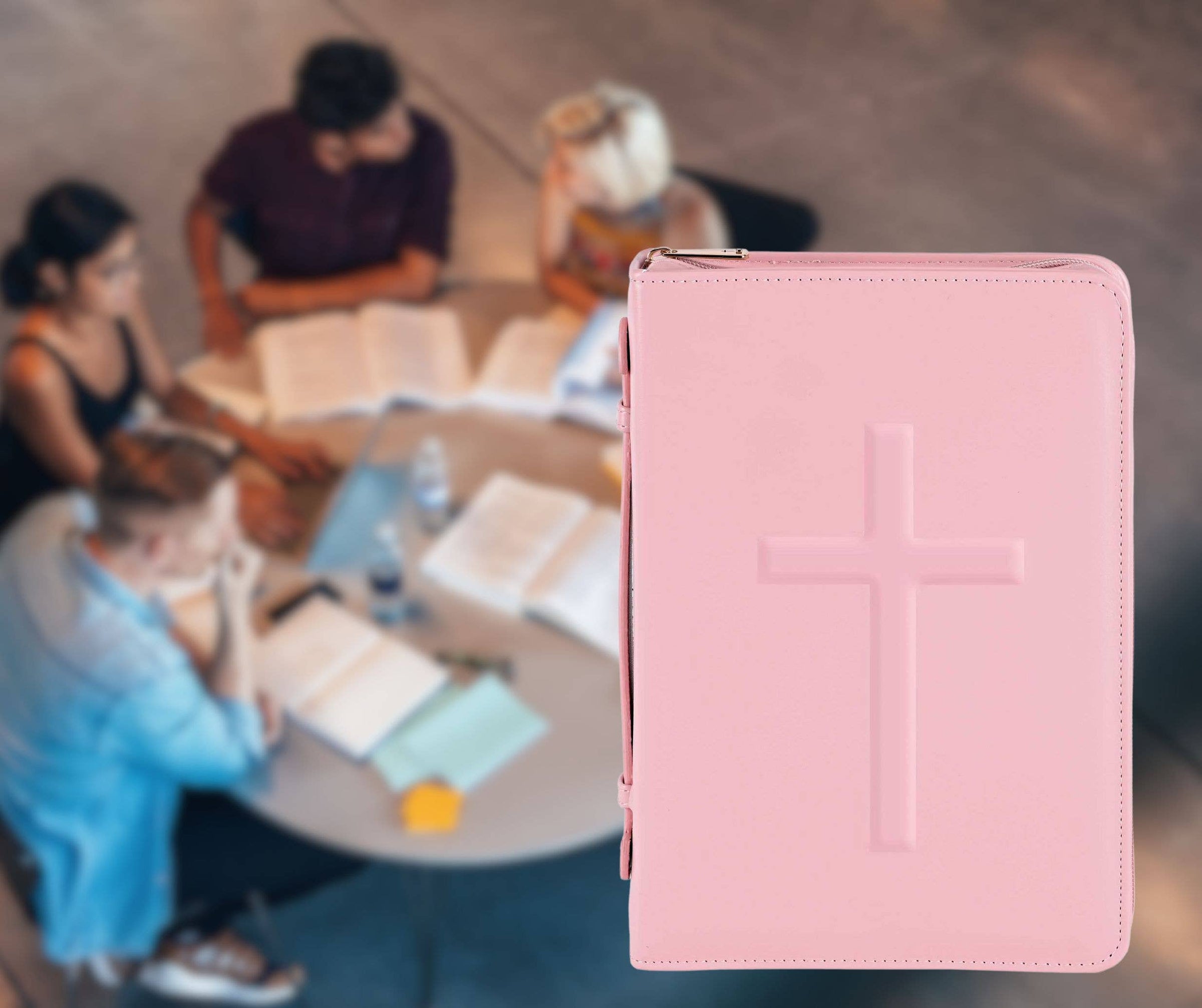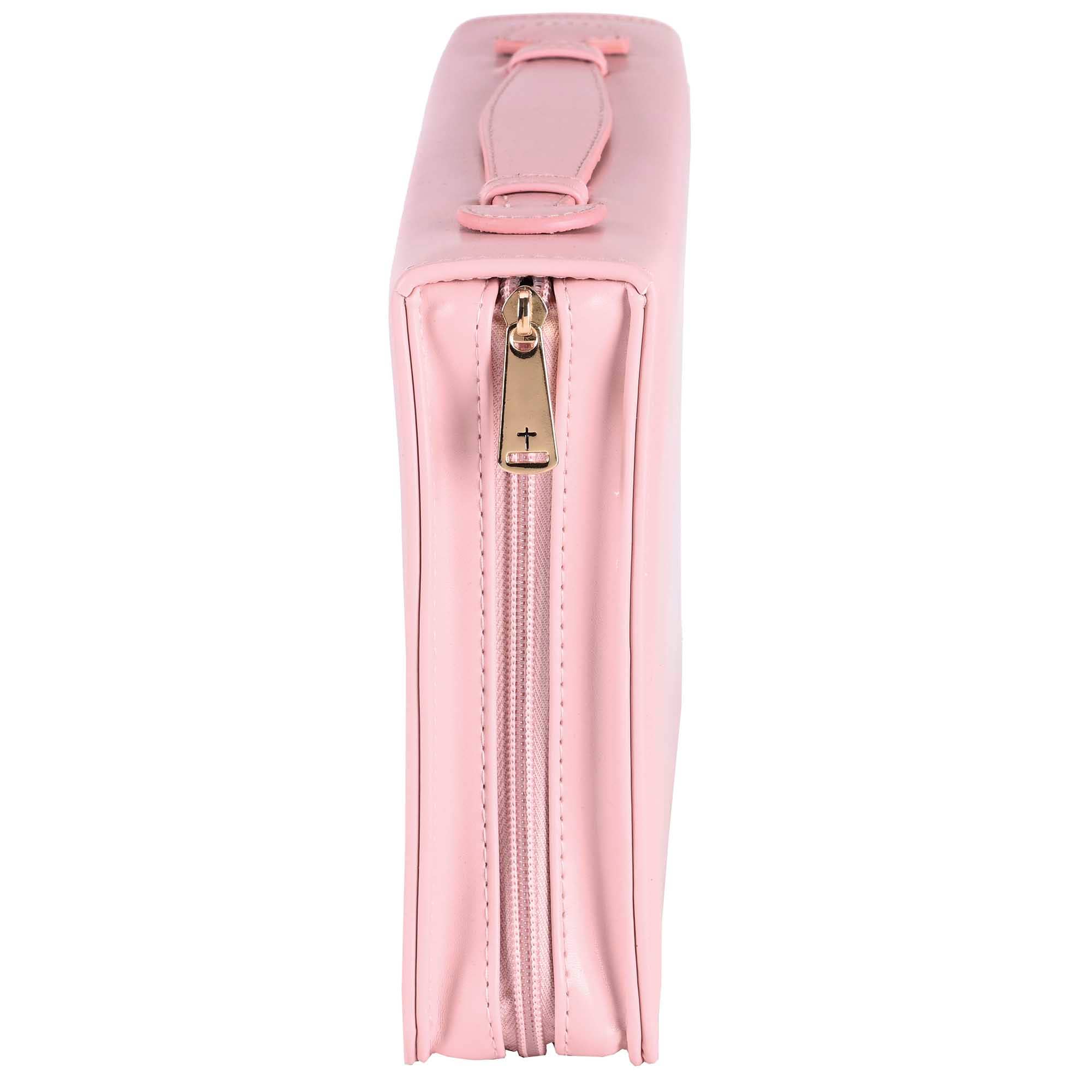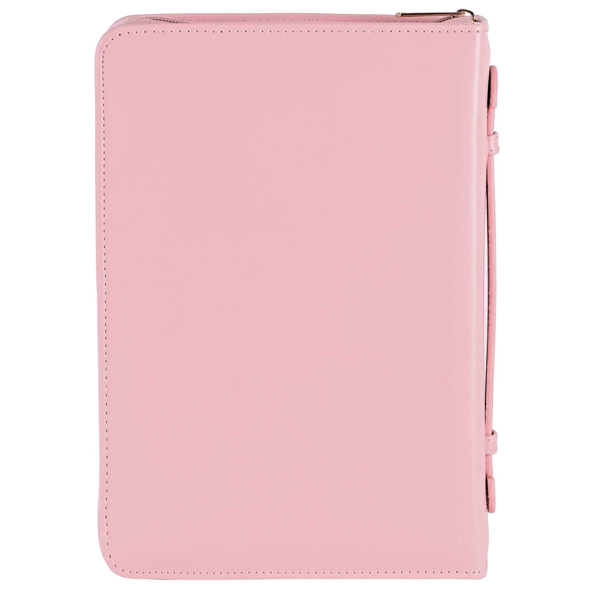 Peace in Pink Bible Case is crafted from durable vegan leather in size XL, this elegant case features a beautifully embossed cross on the front for a touch of timeless grace. Thoughtfully designed with a cross-shaped zipper pull, lay-flat construction, and nylon-reinforced stitching for lasting durability. Inside, an elastic pen loop offers added convenience, while the sturdy spine handle ensures easy carrying wherever you go. Finished with a non-rusting, self-repairing zipper for reliable everyday use.