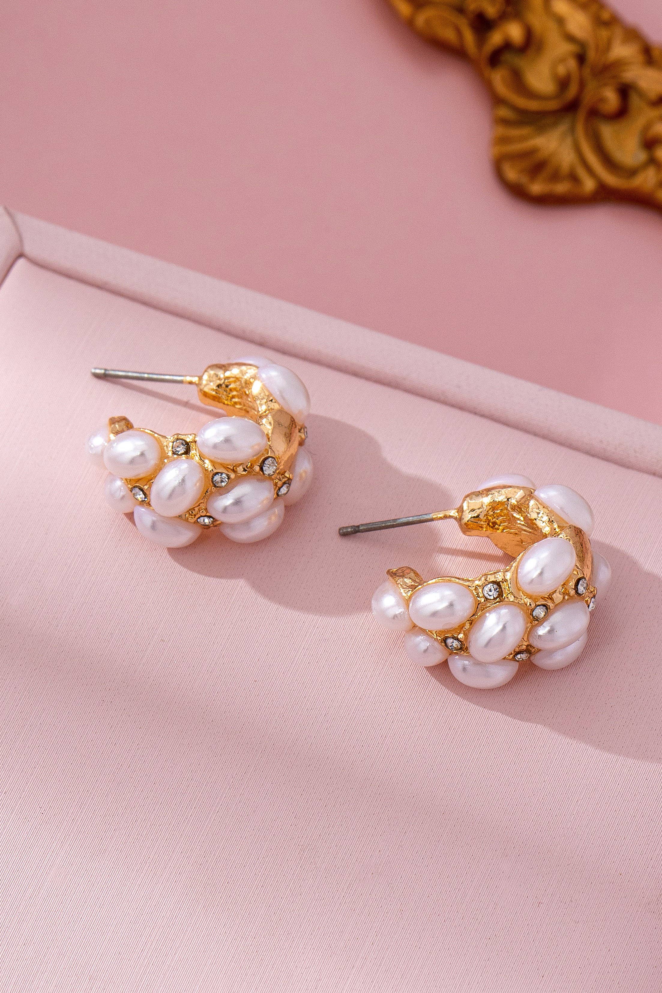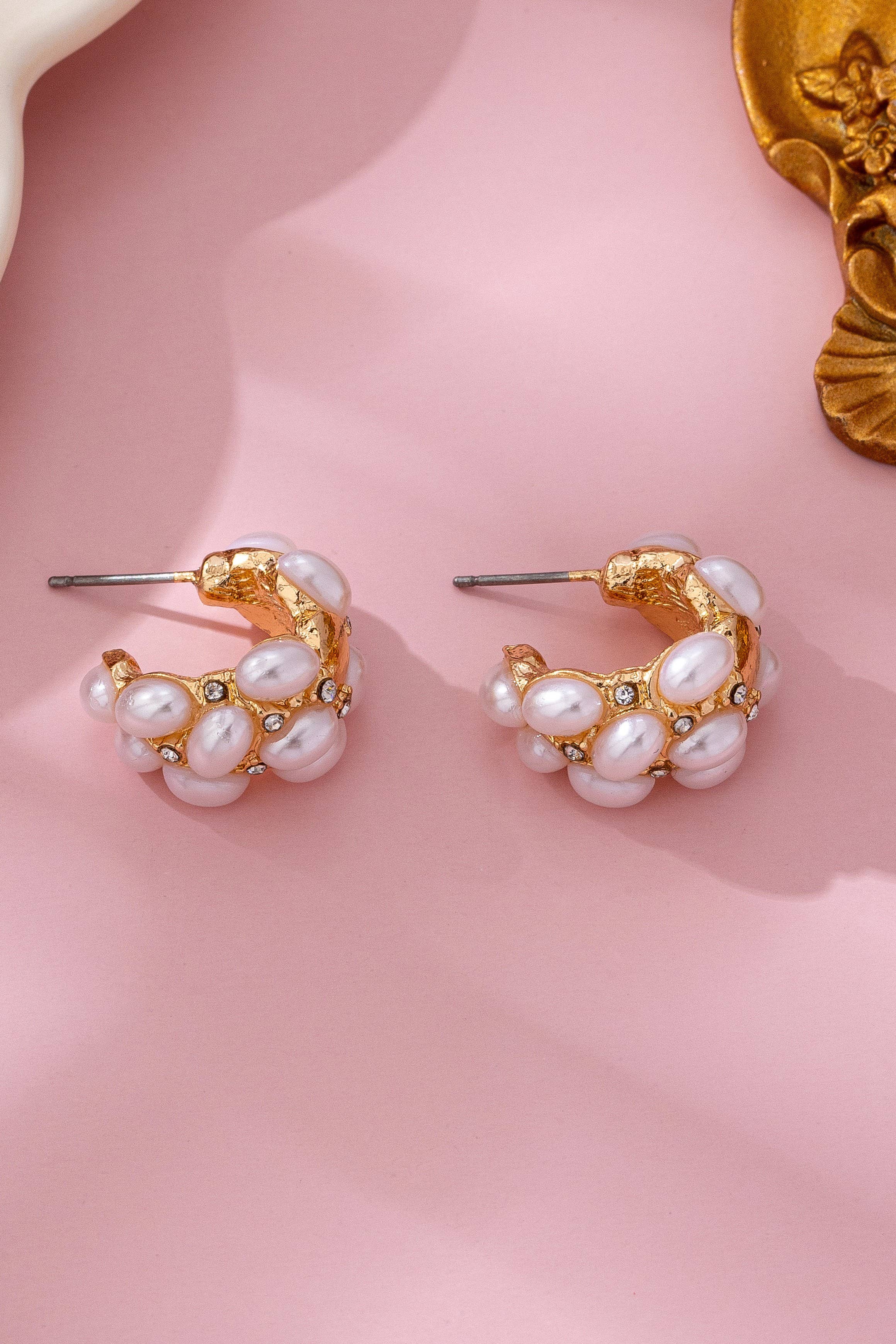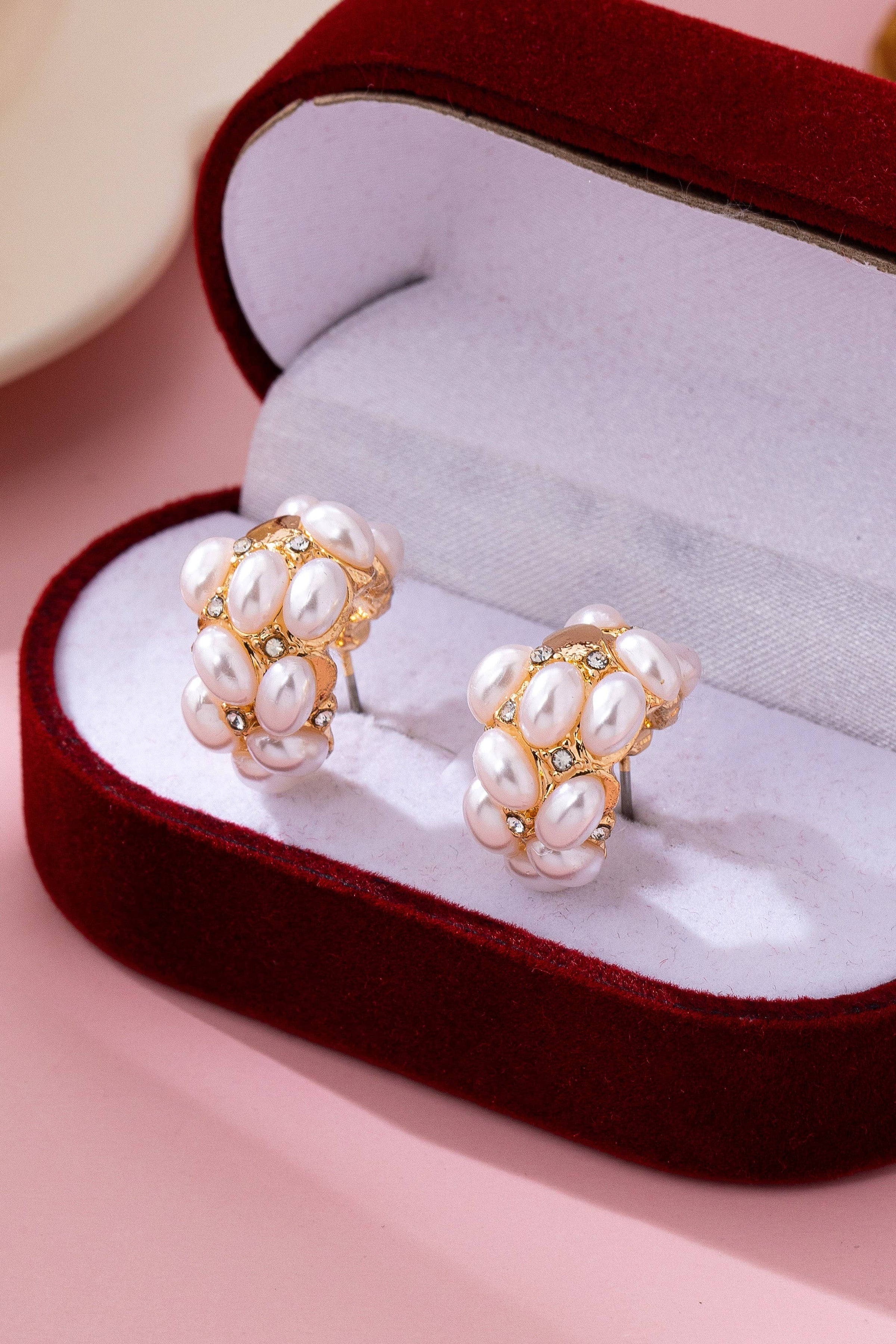 Timeless elegance meets modern luxury with these gold-tone Pearl Cluster Half-Hoops. Adorned with clusters of lustrous faux pearls in varying sizes, perfect for adding a sophisticated touch to any outfit. Titanium posts ensure durability and hypoallergenic wear, making them suitable for sensitive ears, while their lightweight design keeps them comfortable all day.