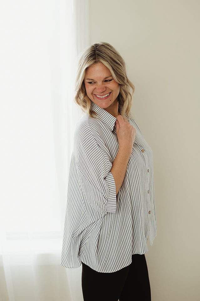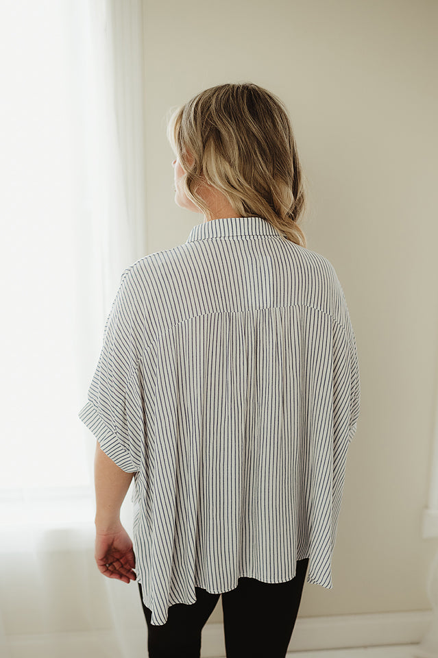 Meet your new go-to essential: this woven Stripe Edit Top button-down combines effortless style with a relaxed, modern edge. Designed with an oversized, boxy silhouette, it drapes comfortably for an easy, laid-back fit. The classic front button closure adds timeless appeal, while the subtle stripe pattern brings a touch of texture and visual interest. Finished with a curved hem for a flattering shape, this versatile piece is perfect for layering or wearing on its own—whether you're dressing it up or keeping it casual.