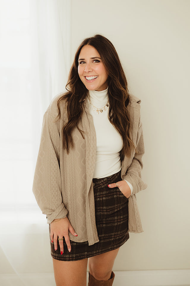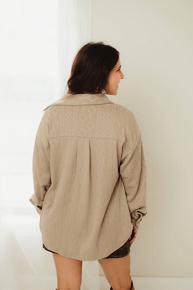 Wrap yourself in cozy vibes with our Cable Comfort Button Up—the oversized long sleeve shirt that's basically a hug you can wear. Featuring a classic cable knit texture, this piece layers beautifully over everything and transitions seamlessly from lazy weekends to casual office days. The relaxed fit means maximum comfort without sacrificing style, while the button-up front lets you customize your look. Perfect for anyone who believes comfort and fashion should always be best friends.
