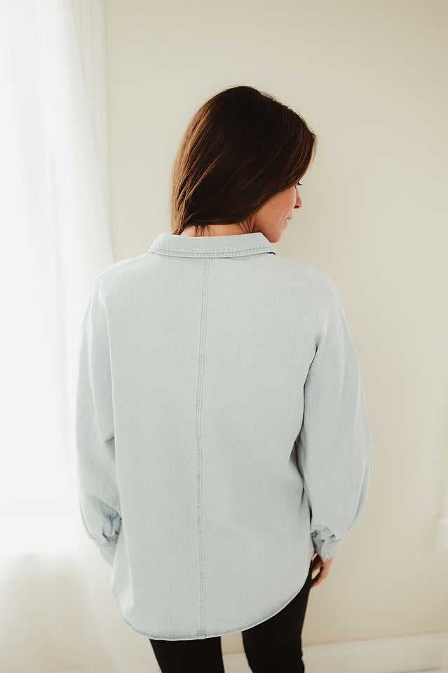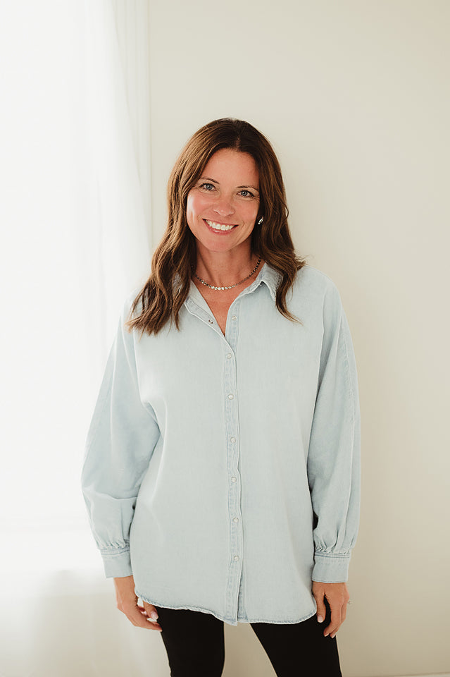 The Claire Balloon Sleeve Denim Top brings effortless style to any wardrobe with its chic button-down design and soft, lightweight denim. The statement balloon sleeves add a touch of feminine flair, making it easy to dress up for outings or keep casual for everyday wear. Versatile and timeless, this top is a year-round staple that pairs beautifully with jeans, skirts, or layered looks for every season.