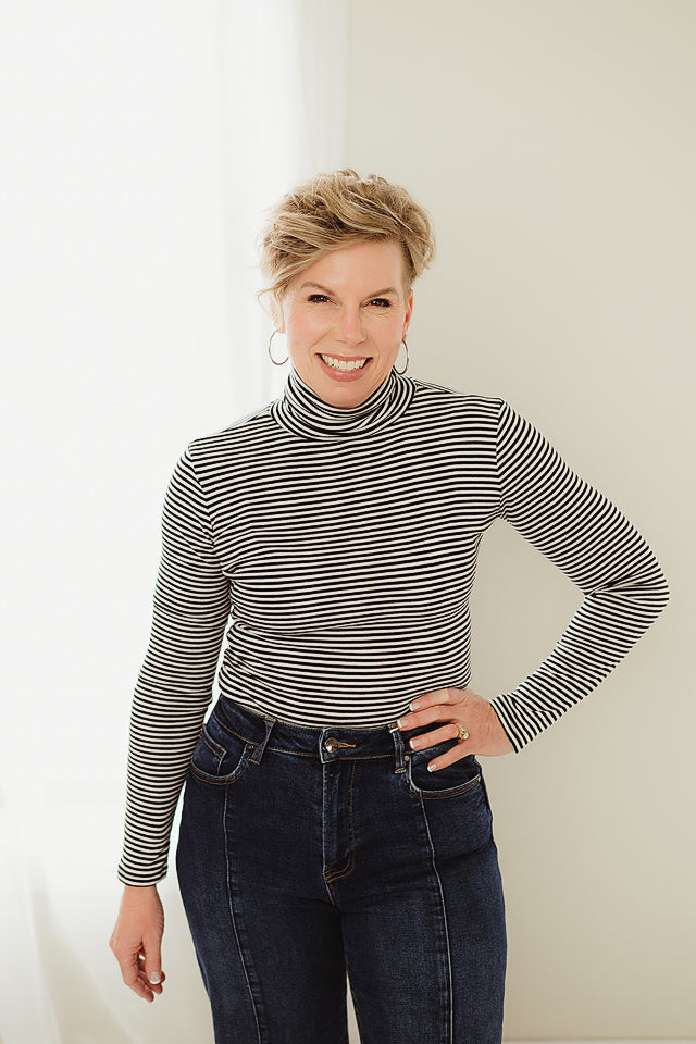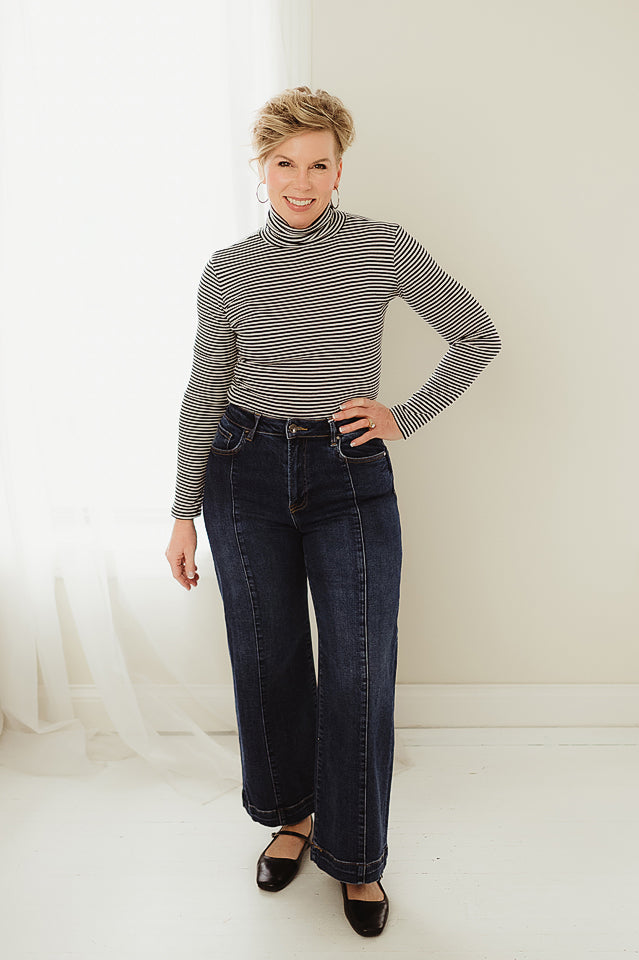 Add a touch of sophistication to your cool-weather wardrobe with Polished Striped Turtleneck. Crafted from soft Y/D stripe rib knit fabric, this long-sleeve top offers a flattering fit with just the right amount of stretch. The classic turtleneck design and timeless stripe pattern make it both chic and comfortable—perfect for layering or wearing on its own. An essential piece for fall and winter, it’s a must-have for achieving that effortlessly dressy yet cozy look.