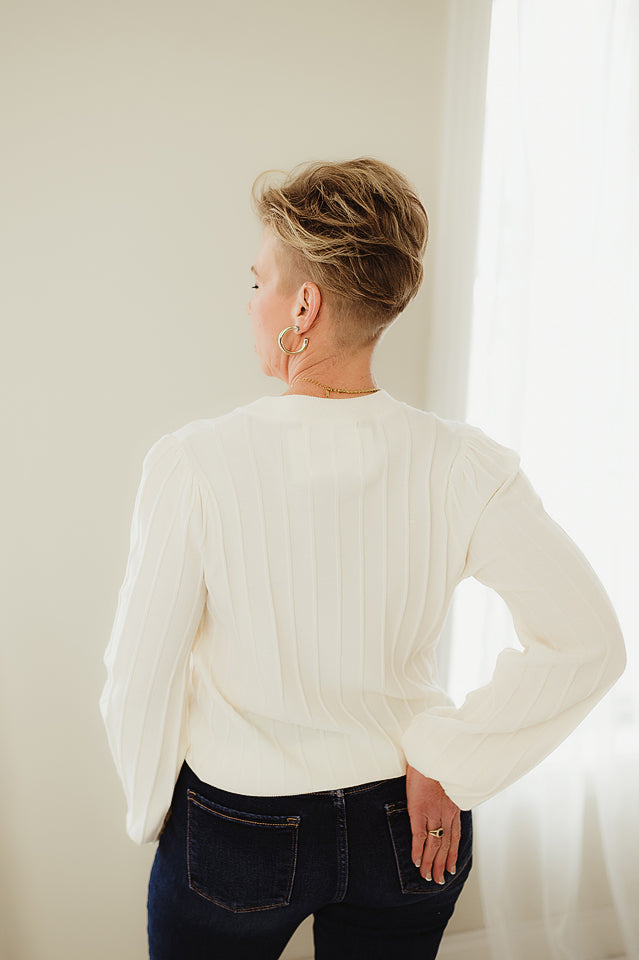 Cozy meets classic in this Sweet Ribbed Cardigan, designed for effortless layering and everyday style. Featuring a round neckline and a full button-down placket, this piece combines timeless details with a relaxed, easygoing fit. The long puff sleeves add a soft, feminine touch, while the ribbed neckline, cuffs, and hem provide subtle structure and a perfectly finished look. Whether worn on its own or layered over your favorite basics, this cardigan brings comfort and charm to any outfit