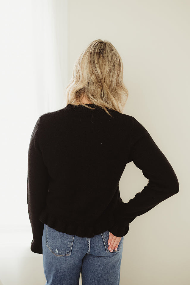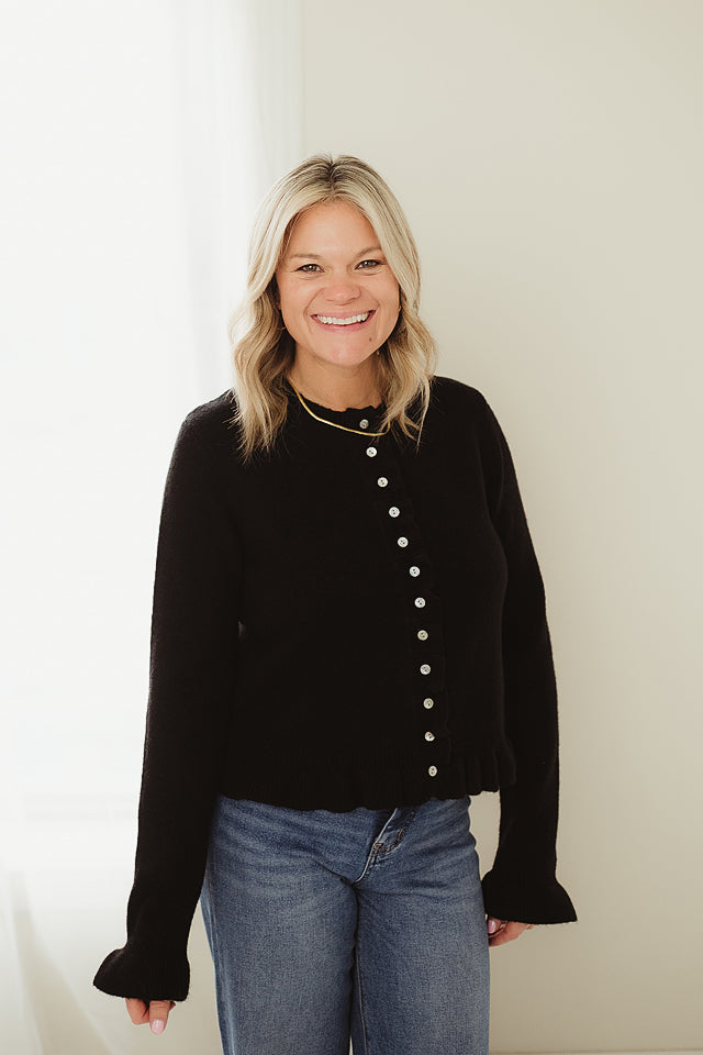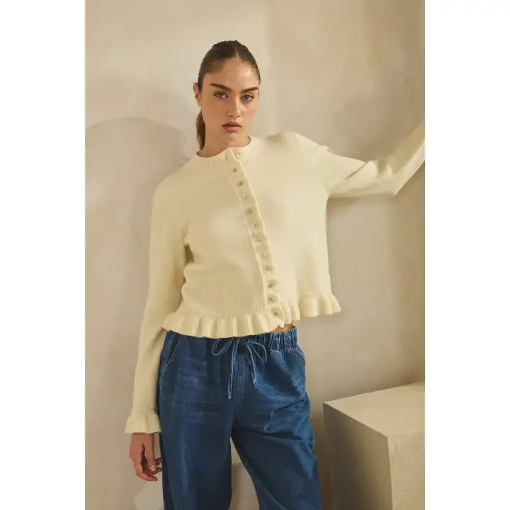 Wrap yourself in effortless elegance with our Ruffle Wave Cardigan—a dreamy layering essential that brings soft romance to every outfit. This plush knit beauty features charming ruffle trim along the hem and cuffs, a crew neckline, and subtle puff sleeves that add just the right touch of whimsy. The tailored fit works beautifully solo or layered over your favorite tops and dresses, while tonal buttons and a hip-length silhouette keep things classically chic. Crafted from a sumptuous blend of polyester, acrylic, wool, and spandex for a gentle, medium-weight feel that hugs just right. Your new go-to for cozy sophistication.