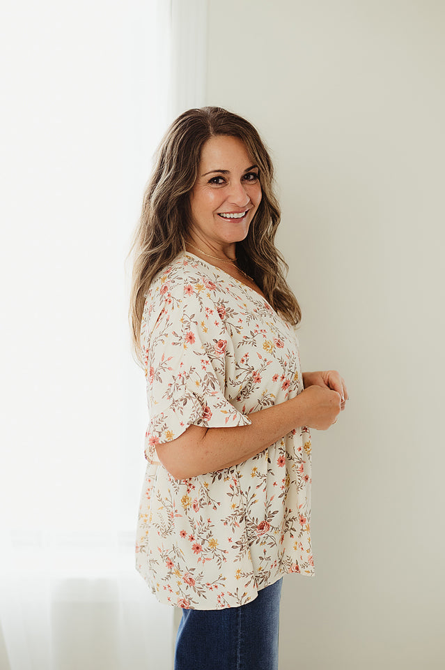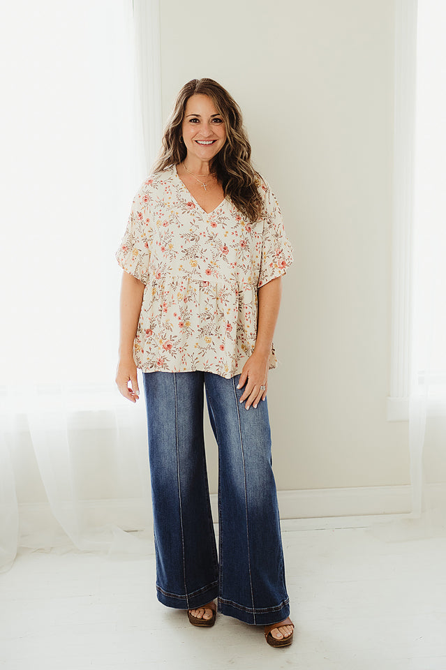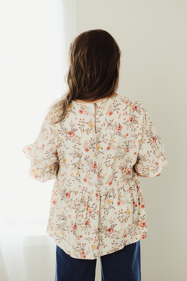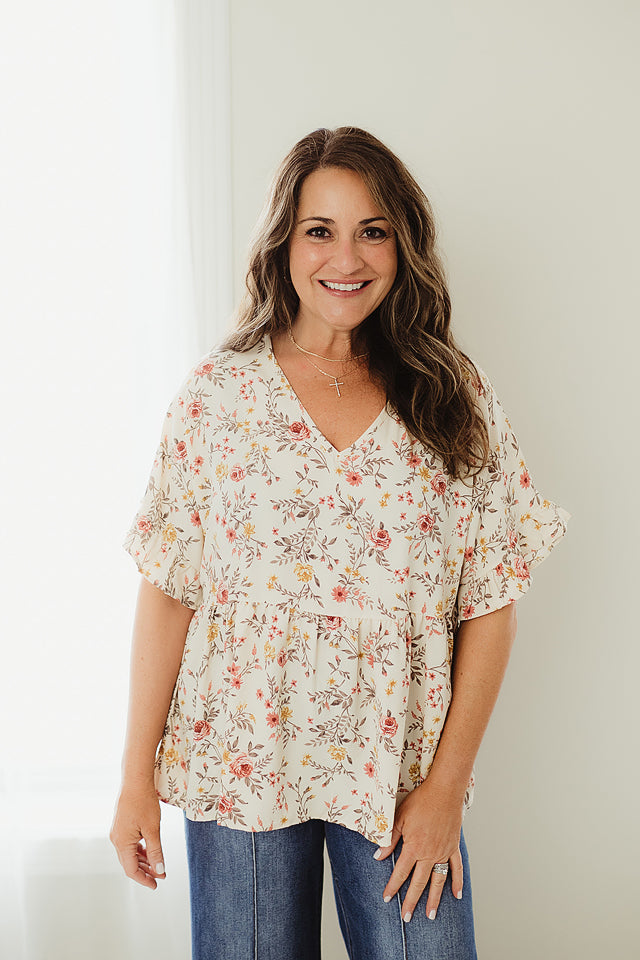 Brighten your wardrobe with this delicate floral Blossom Keyhole Blouse, crafted from lightweight woven fabric. Featuring a flattering V-neck and a keyhole back with a button closure, it combines feminine details with effortless style. Dolman sleeves with subtle ruffles and a babydoll waistline create a soft, flowy silhouette, while the straight hemline keeps it easy to pair with jeans, skirts, or shorts for a breezy, everyday look.