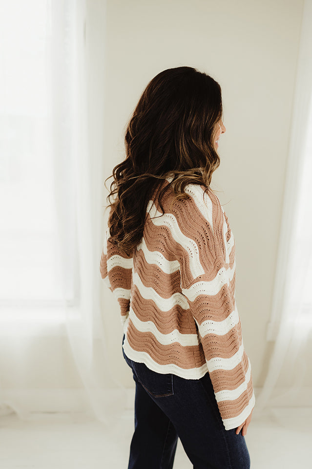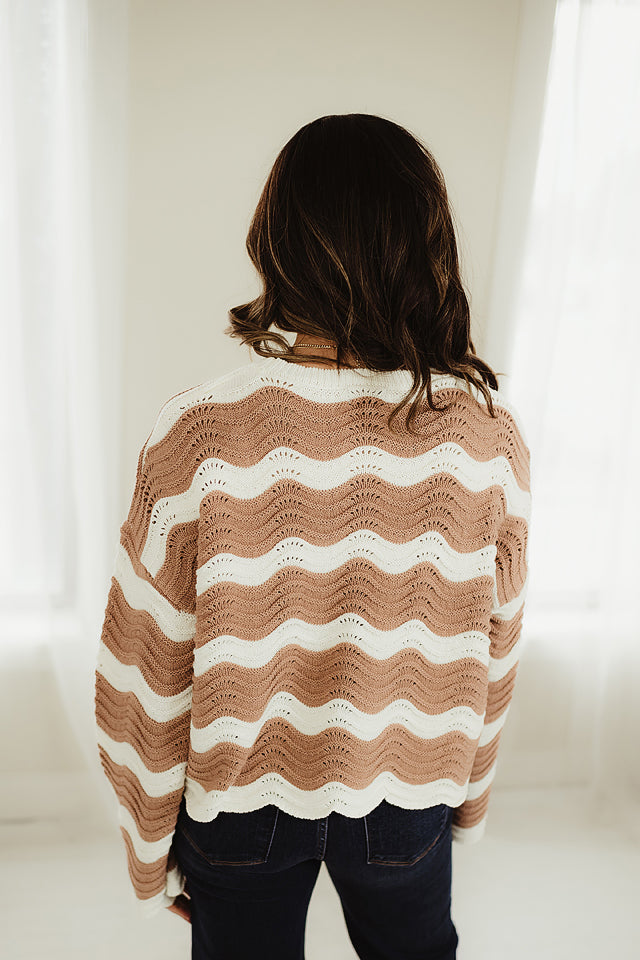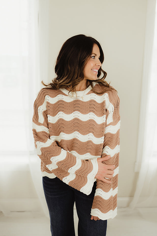 Make a bold statement with this eye-catching Ripple Effect Knit Pullover. Designed with a scalloped wave pattern that adds dimension and movement, this cozy piece features a relaxed fit and long sleeves for easy, all-day wear. The soft open-knit construction ensures breathability while still providing warmth, making it a perfect choice for transitional weather. Style it with your favorite denim or layer it over a dress for an effortlessly elevated everyday look. Ideal for those who love a mix of comfort and standout detail.