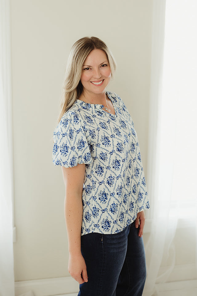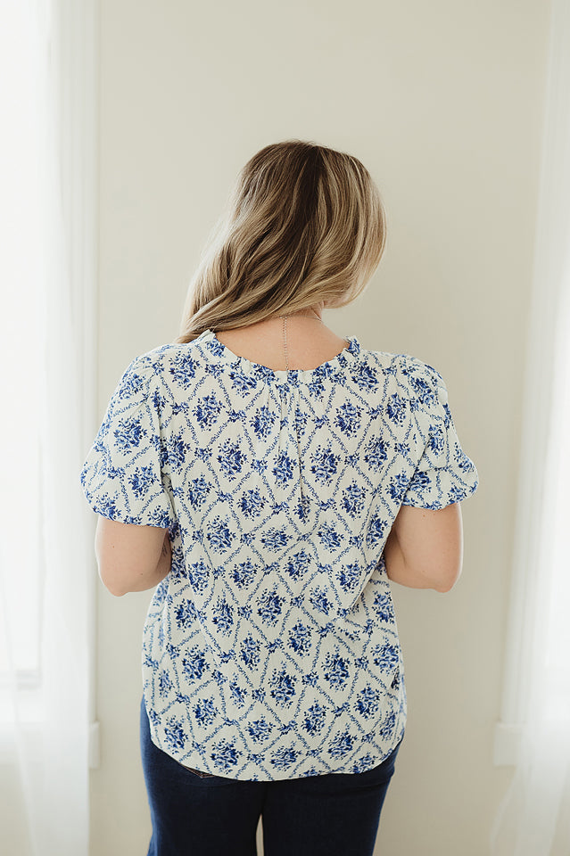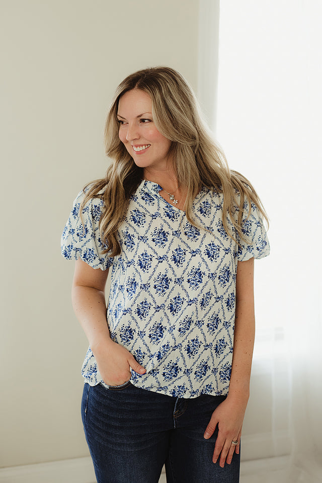 This charming floral Garden Puff Sleeve Blouse is a perfect addition to your summer wardrobe. Featuring a fresh blue and white floral pattern arranged in a diamond lattice design, it offers a light, feminine look that’s perfect for warm days. The V-neckline is accented with subtle ruffled trim for a delicate touch, while short puff sleeves create a playful and stylish silhouette. Easy to dress up or down, it pairs effortlessly with jeans, shorts, or skirts for a versatile and chic outfit—perfect for casual lunches, beach days, or summer getaways.