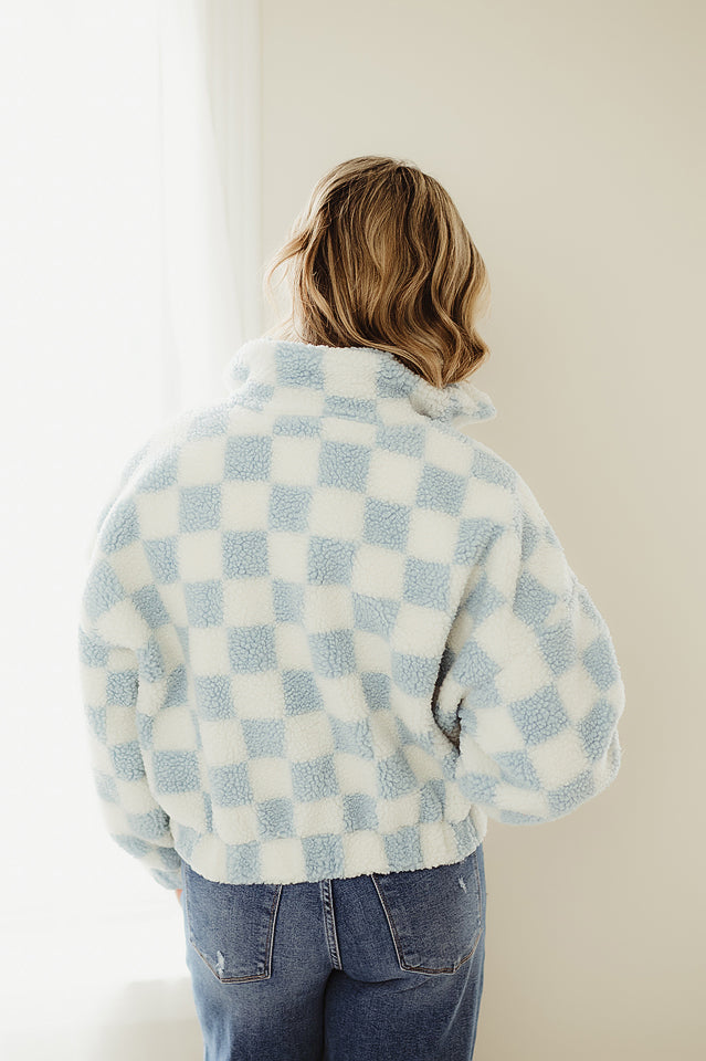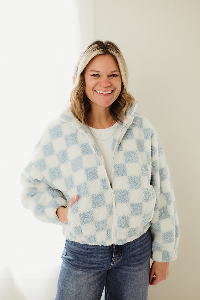 Wrap yourself in cozy-chic vibes with the Alayna Checkered Jacket. Crafted from ultra-soft sherpa that feels like a cloud, this oversized layer features a dreamy blue and cream checkered pattern perfect for that effortless vintage aesthetic. The full zip front and high collar deliver both warmth and style, while the relaxed fit gives you that cool-girl edge. Layer it over anything—tanks, tees, or dresses—for instant personality. Comfort meets trend without breaking the bank.