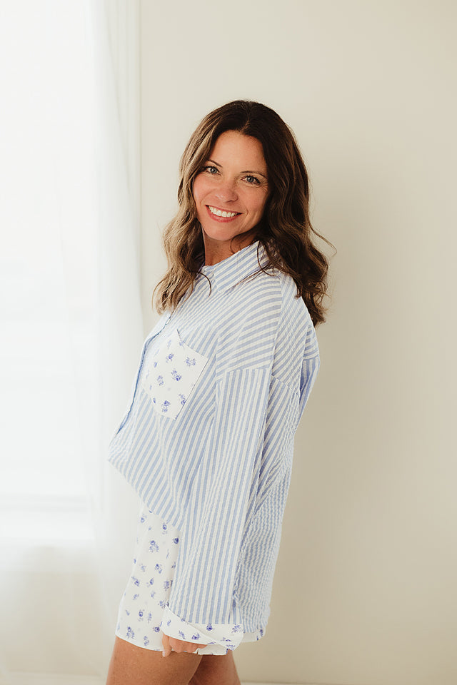 Elevate your everyday style with the Bloom Button Down—a charming collared shirt that brings garden-fresh flair to your wardrobe. Featuring eye-catching floral contrast details, a relaxed drop-shoulder silhouette, and long sleeves, this button-front beauty strikes the perfect balance between polished and playful. Whether you're dressing up for brunch or keeping it casual, this versatile piece adds a pop of personality to any outfit.