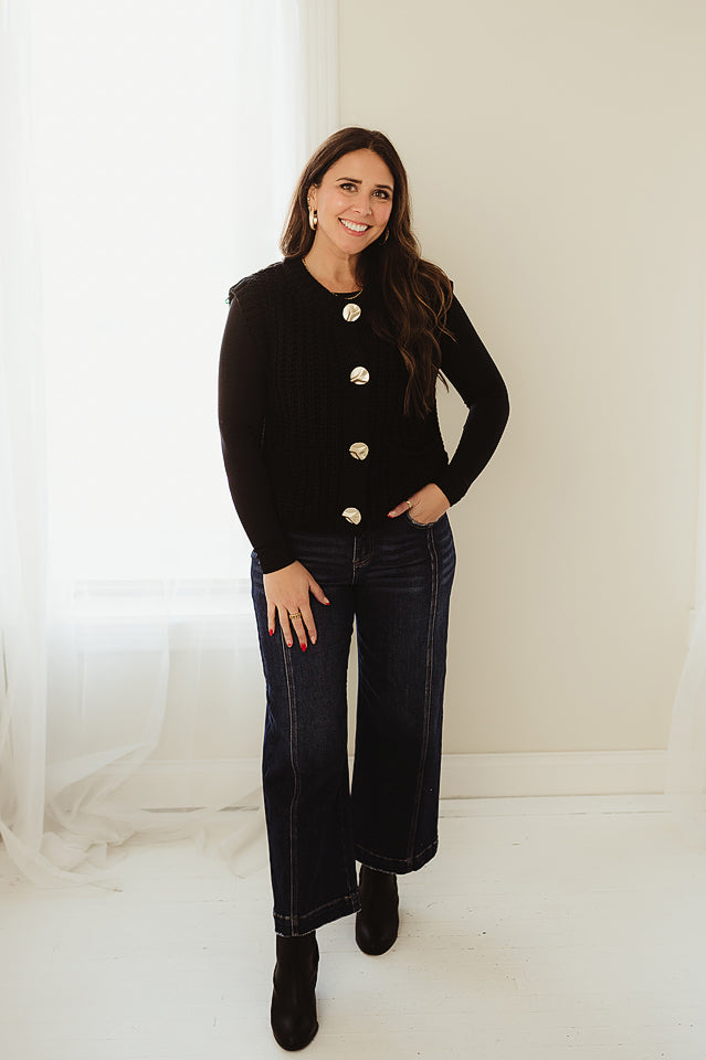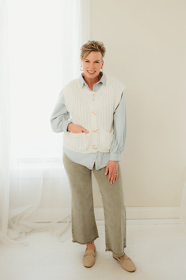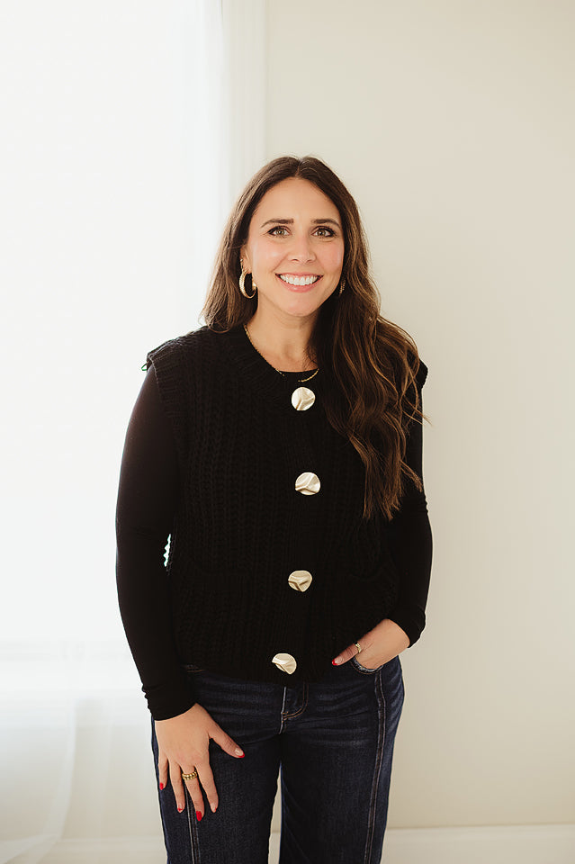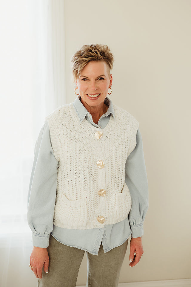 Layer up with our Elevated Everyday Vest—a knit sweater vest that brings effortless sophistication to any outfit. Featuring gleaming gold buttons and a classic button-down design, this piece transitions seamlessly from casual weekends to polished workdays. The cozy knit fabric keeps you warm while the timeless silhouette ensures you'll reach for it season after season. Perfect for styling over tees, collared shirts, or dresses, this vest is your new wardrobe MVP.