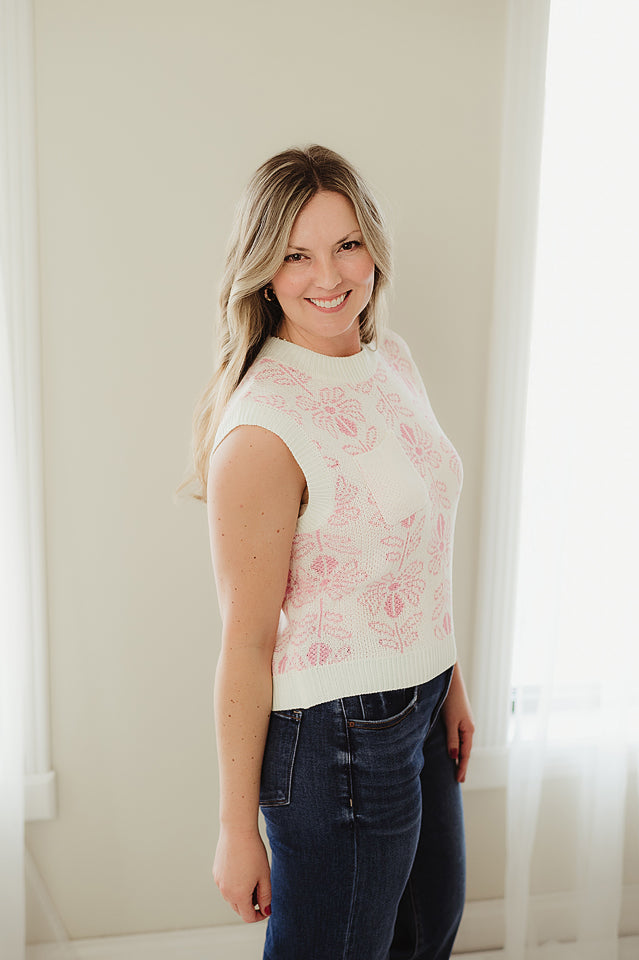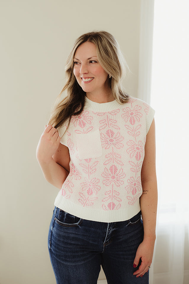 Lovely, cool, and endlessly versatile, this Flower Pattern Sweater is a standout staple for any season. Designed in a soft knit fabrication, it features a charming flower pattern, a front pocket for added detail, and a ribbed bottom band for a classic finish. The sleeveless silhouette offers cozy ease on its own or pairs perfectly with your favorite lightweight long-sleeve for effortless layering.