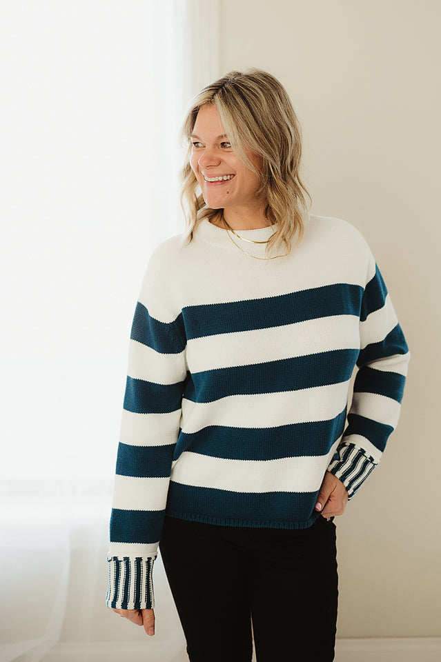 Cozy up in our Mountain Stripe Sweater, where classic stripes meet modern comfort. This boxy-fit pullover features eye-catching striped cuffs that add a fun twist to an everyday essential. Perfect for layering or wearing solo, it's the kind of piece that makes getting dressed feel effortless and stylish. Soft, versatile, and ready for whatever adventure comes your way.