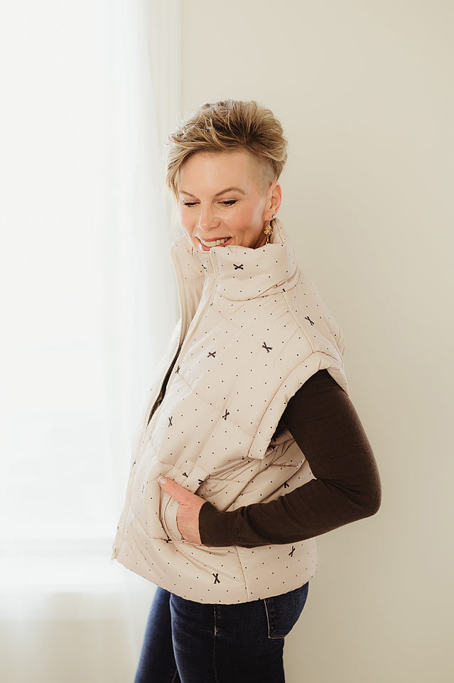 Adorable Polka Dot Bow Vest is perfect for layering! This sleeveless style features a mock neckline, convenient zip-up front, and functional pockets to keep essentials close. It is lightweight but provides warmth without bulk, making it ideal for transitional weather. A charming addition to any casual wardrobe that brings personality and practicality together.