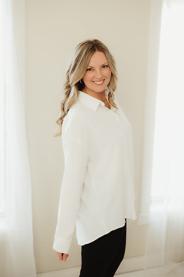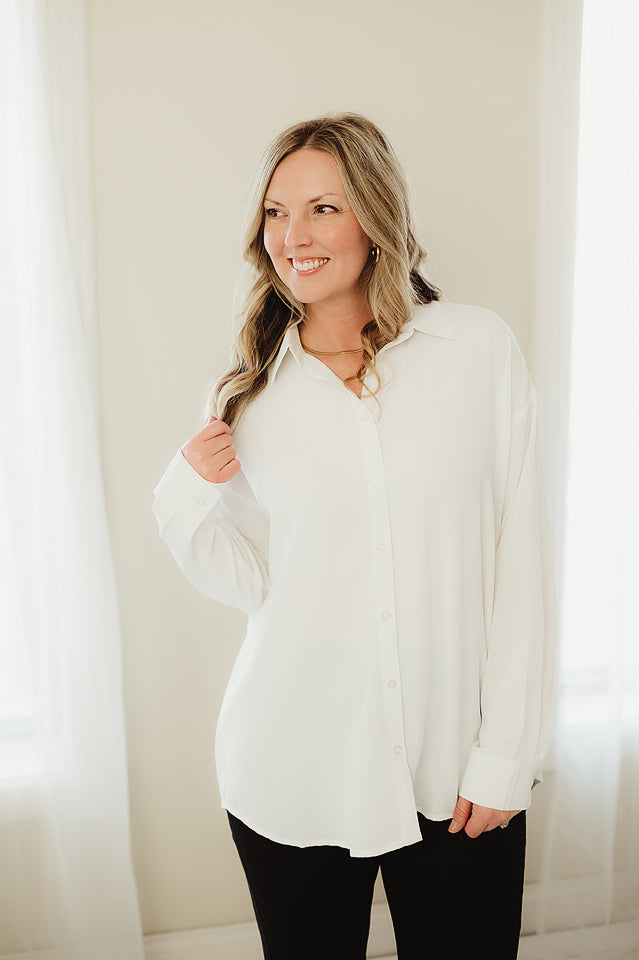 Effortlessly chic and ready for anything, The Luxe Layer Blouse is your new wardrobe MVP. Crafted from slightly stretchy crepe, this oversized shirt features a relaxed drop shoulder silhouette with a flattering back yoke that moves with you. Buttoned cuffs and an oversized sleeve design create that coveted laid-back elegance, while the flat button placket keeps things streamlined. It's the perfect piece to layer, tie up, or wear solo. Versatile, comfortable, and undeniably cool.