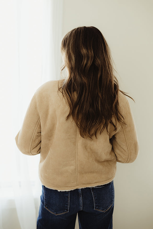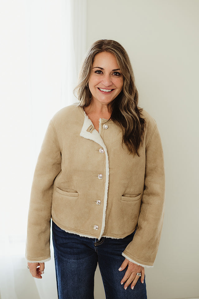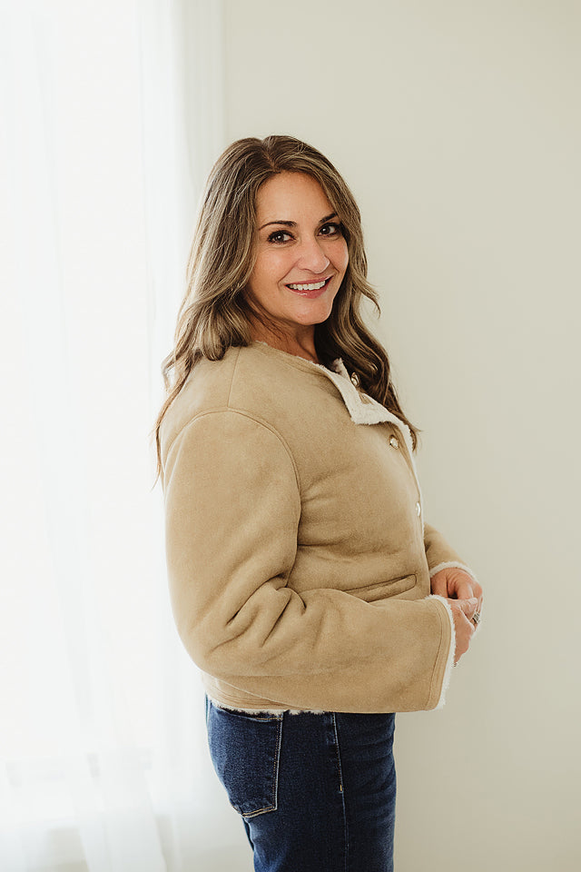 Elevate your winter wardrobe with The Statement Suede Jacket — a must-have for staying warm and stylish. Crafted from soft faux suede and lined with plush faux fur, this jacket combines comfort and sophistication effortlessly. Featuring a round neckline and gold button closure, it’s perfect for dressing up casual looks or layering over your favorite stylish outfits. Trending, chic, and versatile, this fur-lined jacket is the ultimate statement piece for a polished, dressy winter look.