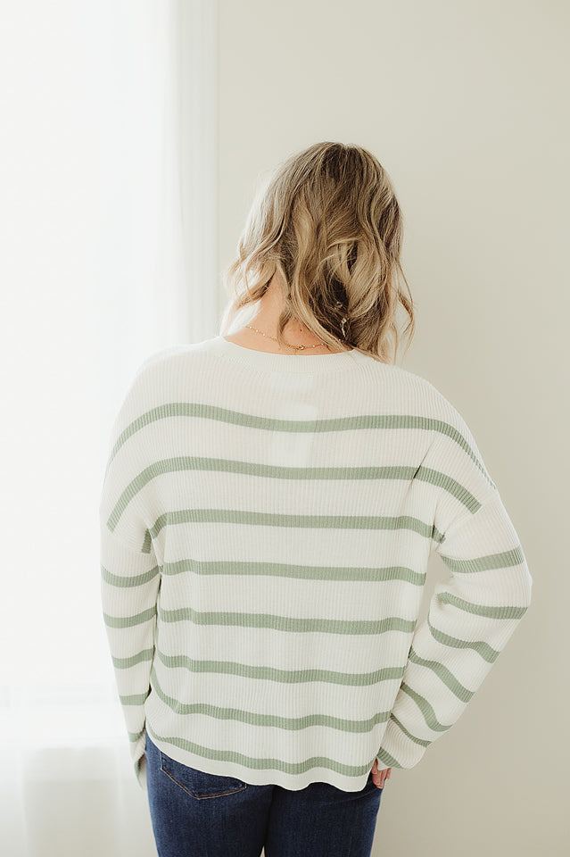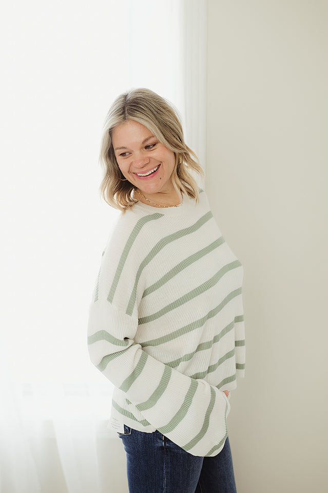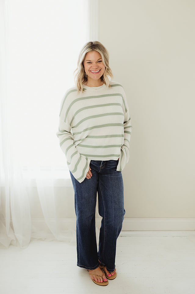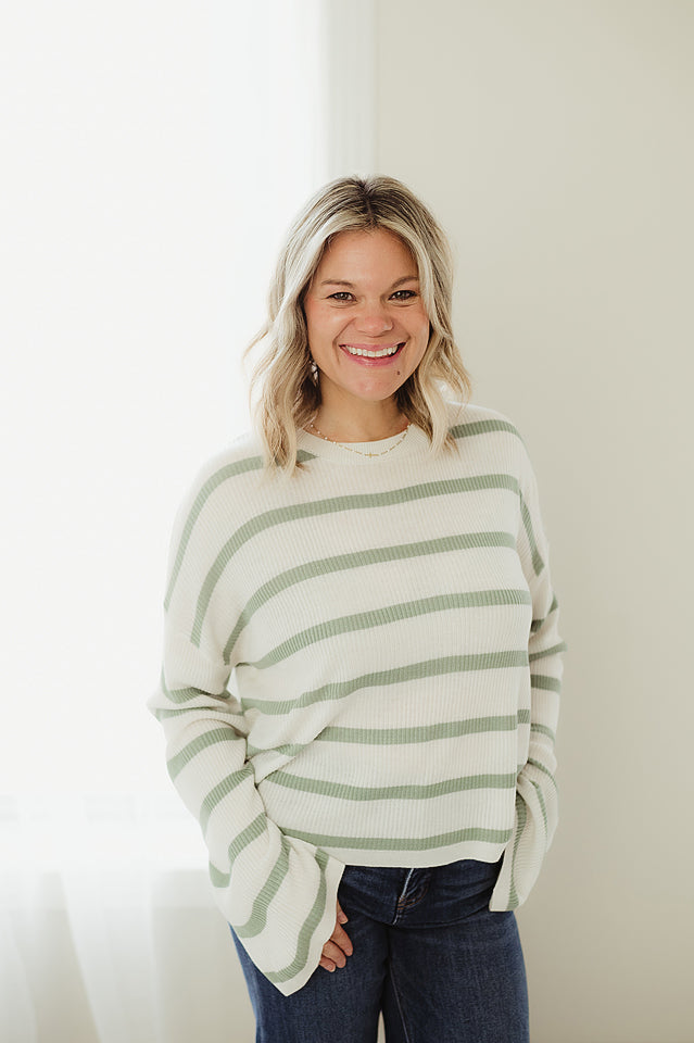 Weekend Stripe Ribbed Pullover is the perfect lightweight essential. Crafted with a soft, comfortable feel, it features a vertical ribbed texture accented by bold horizontal stripes. Designed with a classic crew neckline and roomy drop-shoulder wide sleeves, this relaxed-fit sweater pairs effortlessly with a denim skirt and ankle boots for an easy weekend look.