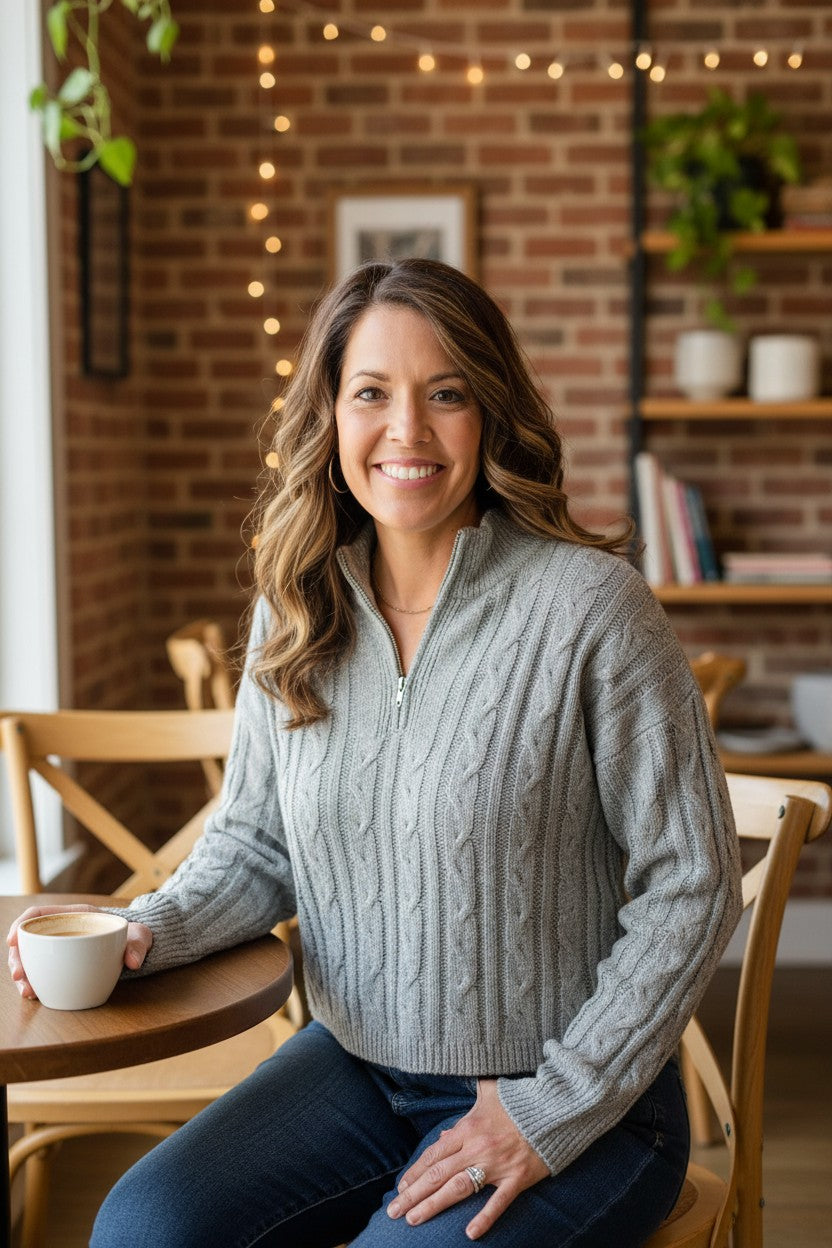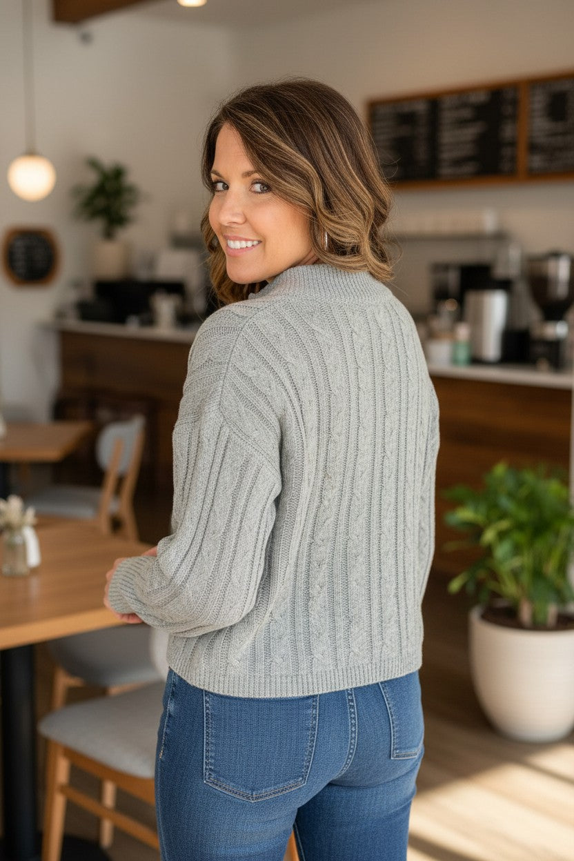 Stay cozy and stylish with Colette Cable Knit. Crafted from soft, brushed knit fabric, it features a classic cable knit pattern that adds texture and visual interest. The full zip closure allows for easy layering, while ribbed cuffs and hem provide a polished finish. Perfect for casual outings or relaxed days at home, this versatile sweater combines warmth, comfort, and timeless style.