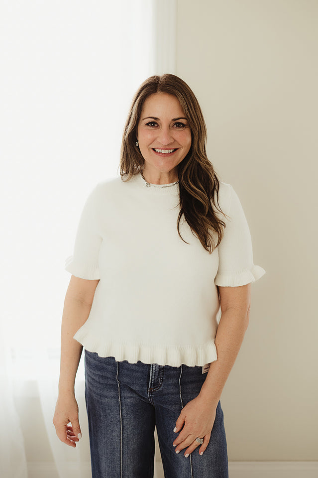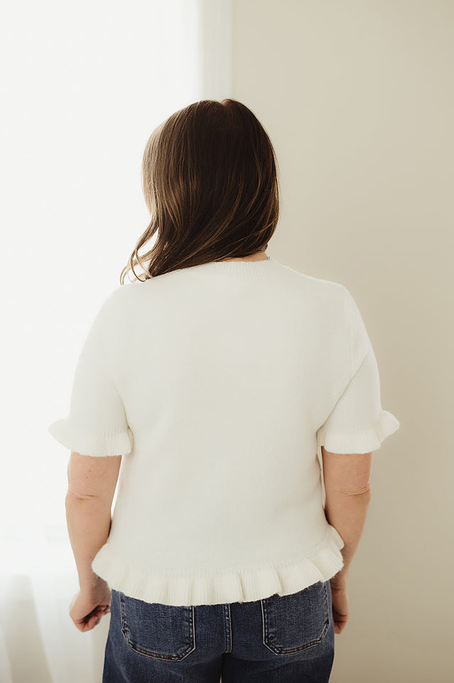 Soft with a feminine touch, this Simply Sweet Knit is an effortless essential for spring layering. Crafted from a soft, lightweight knit with a gentle hand feel, it features a relaxed fit that falls at the waist for easy styling. Short sleeves with subtle ruffle edges and a delicate ruffle hem add a charming detail, while the ribbed crew neckline keeps the look clean and polished. Designed in an easy pullover silhouette, it’s perfect for everyday wear—layer it under a blazer or pair it with denim for a casual yet refined look.