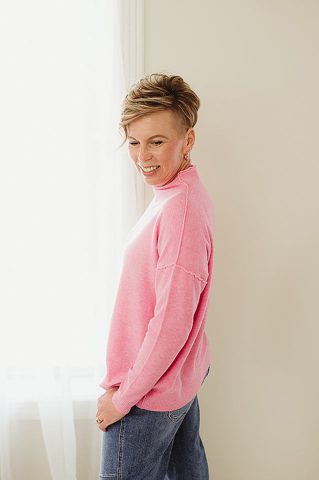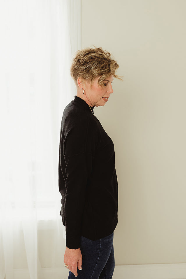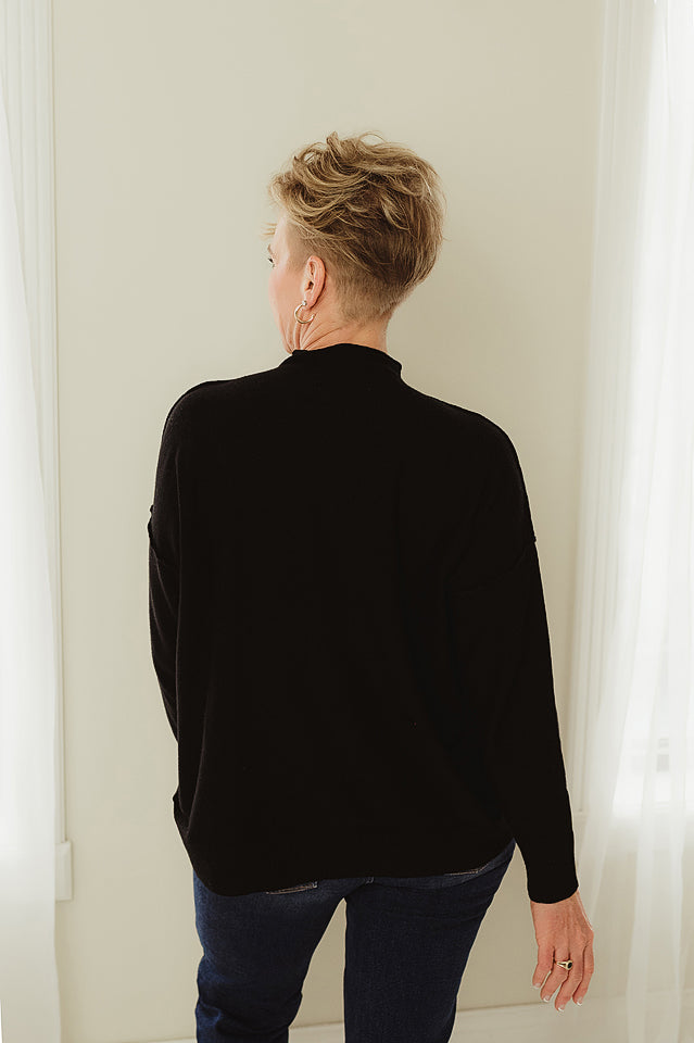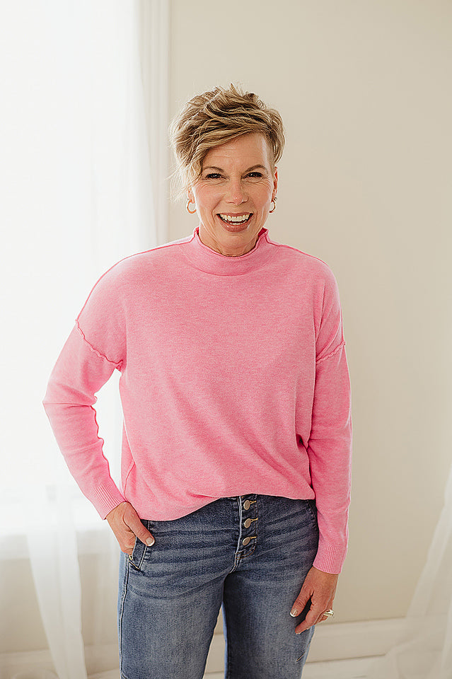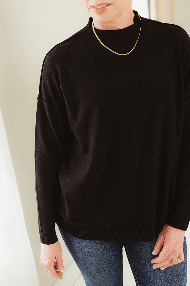 Luxe Line Sweater — a timeless staple with a modern twist. Crafted from soft, high-quality viscose, this sweater offers a smooth, comfortable feel and a flattering fit. The mock neck adds a touch of sophistication, while the exposed seam detailing gives it an effortlessly chic edge. Perfect for layering or wearing solo, it’s the versatile piece your wardrobe will reach for season after season.